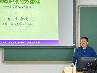 5月17日晚,球王会体育平台党校求理分部第八期青年马克思主义研修班理论培训第三讲在新主楼B102举行,清华大学教授、博士生导师、国家“万人计划”哲学社会科学领军人才邹广文做题为《中国式现代化的文化解读——学习党的二十大报告》的报告。