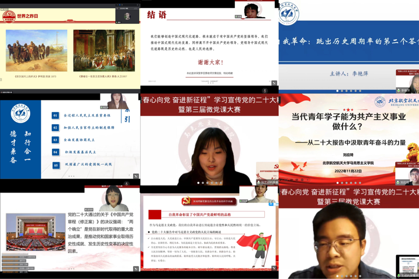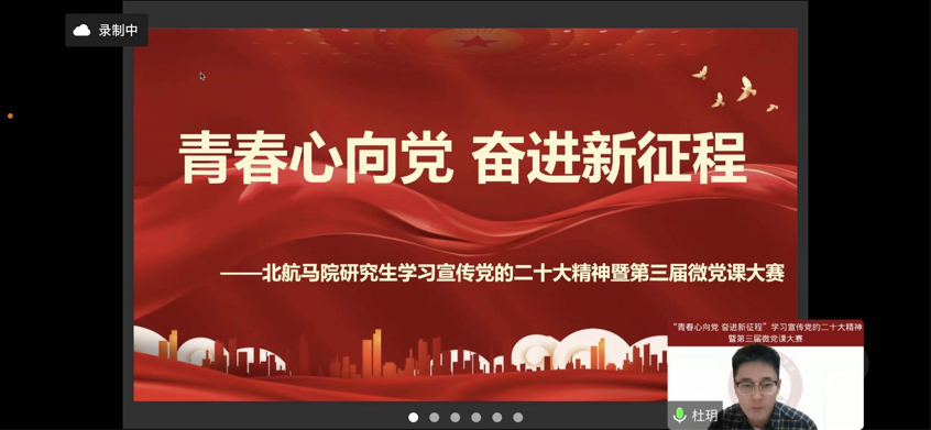 近日,为深入学习贯彻党的二十大精神,进一步学懂弄通做实习近平新时代中国特色社会主义思想,提升研究生的思想理论水平,球王会体育官方网站举办的“青春心向党,奋进新征程”学习宣传党的二十大精神暨第三届微党课大赛。副院长陈萌、2022级博士班主任巩永丹、硕士班主任徐冶琼和2021级硕士班主任刘浩然担任比赛评委,参赛研究生通过线上方式进行宣讲展示,全体硕士研究生旁听。比赛由2022级研究生辅导员杜玥主持。