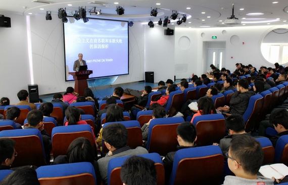 下午,De Waele院长在人文讲堂为球王会师生做了题为“社会主义在苏联和东欧失败的原因探析”的学术报告,从欧洲学者的视角看苏联及东欧的政治体制变革、共产主义运动失败这段历史及其政治、经济、社会等层面的原因,报告内容涉及政治学、历史学、经济学等多学科内容,他见解独到、通今博古、语言风趣、深入浅出,并与台下听众充分互动交流,受到与会师生热烈欢迎。