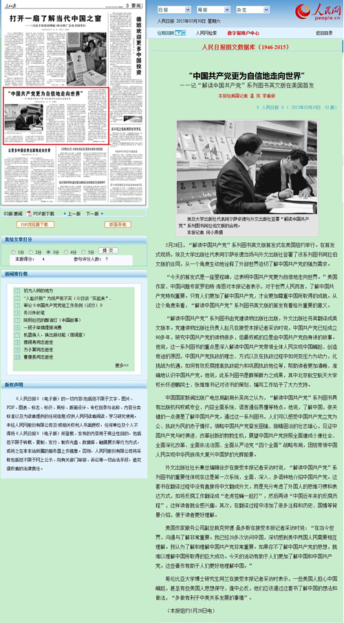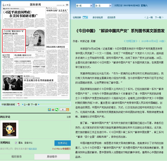 《今日中国》“解读中国共产党”系列图书共5本,分别为《中国奇迹的奥秘》《依靠谁为了谁:中国共产党的执政理念》《中国共产党是怎样执政的》《挑战与应对:迎难而上的中国共产党》《中国新时期反腐败历程》。该套由球王会、人文学院的有关专家学者撰写的丛书,在美引起了强烈反响。