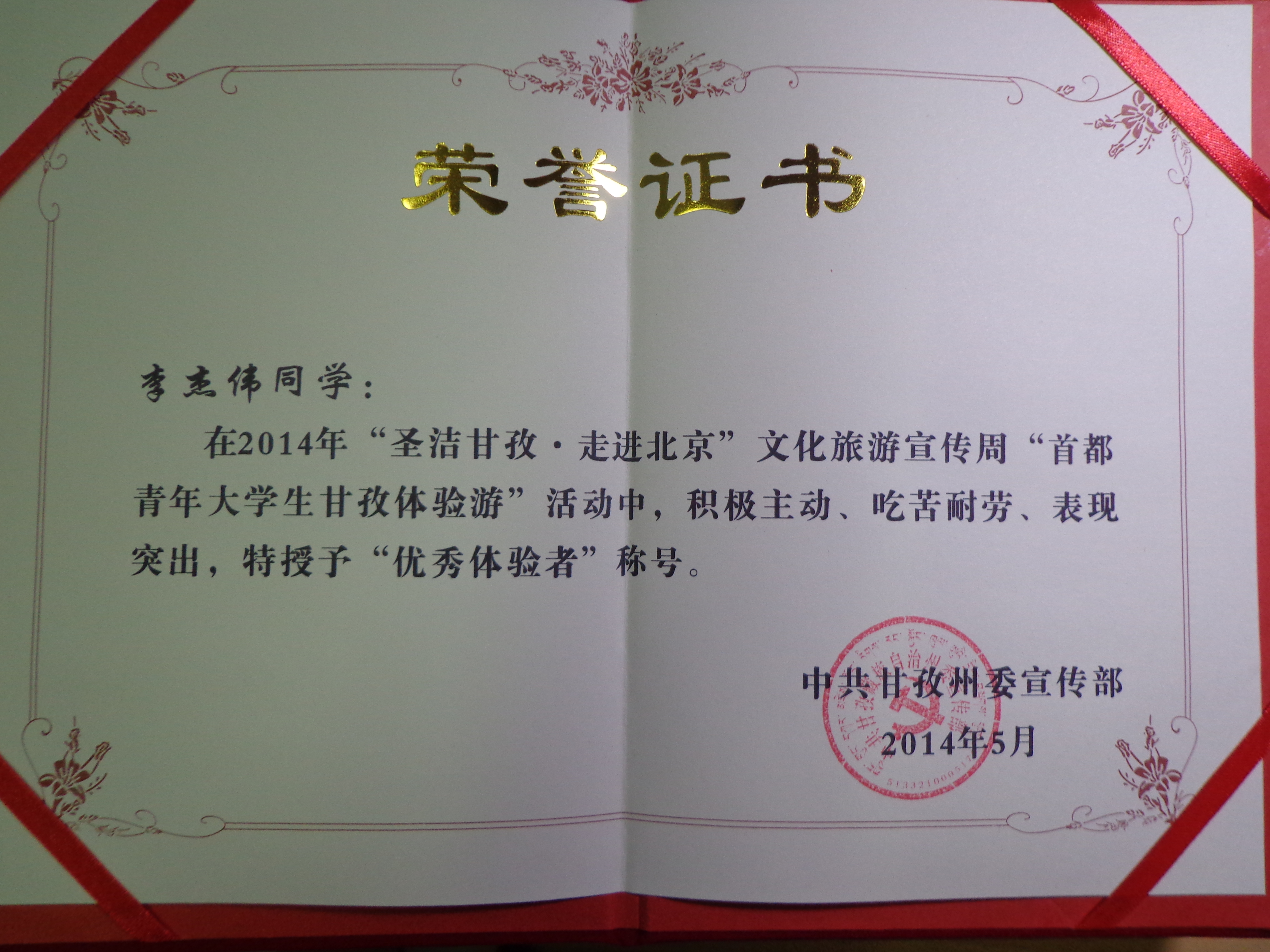 近日在由四川省甘孜州政府和新京报主办,北京电视台和腾讯网等多家媒体协办的“首都青年大学生甘孜州体验游”活动中,球王会2013级硕士研究生李杰伟代表北航成为六名体验者中的一员。在活动中,李杰伟同学积极主动、吃苦耐劳、表现突出,得到了甘孜州政府的肯定,获得“优秀体验者”荣誉称号,并接受了北京电视台的采访,展现出球王会学生青春昂扬、勇于挑战的精神风貌。
