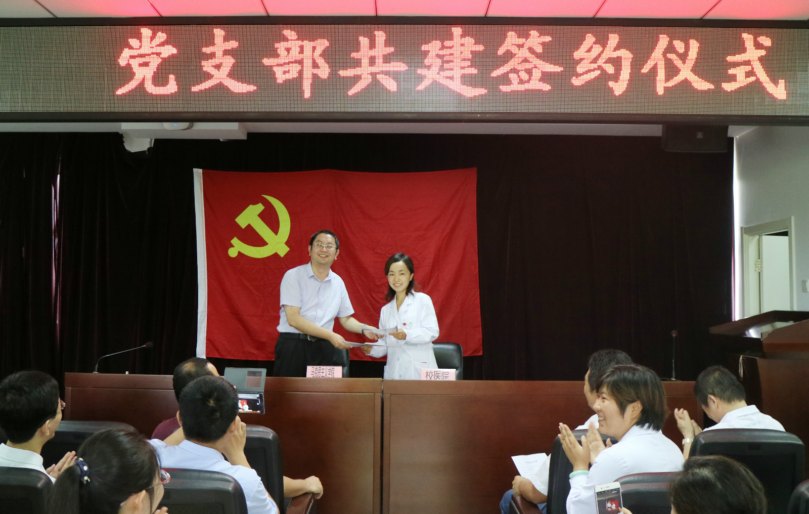 为进一步深入推进“两学一做”学习教育,加强基层党组织建设,实现资源共享和优势互补,近日,球王会教工党支部与校医院医生党支部支部开展党组织共建活动并举行签约仪式。球王会副院长赵义良、教职工支部书记高宁,校医院党总支书记徐亚军、院长张新华、副院长曹丽娟、副院长赵秀欣,以及双方党支部全体成员均出席此次活动。签约仪式由校医院医生党支部宣传委员卢艳主持。