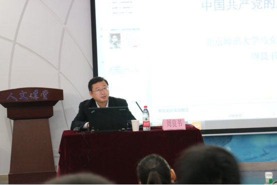 其后,周良书教授从毛泽东选集第一卷的“分清敌我”和“确立统一战线”两个方面出发,介绍了相关的问题和历史依据。并运用马克思的阶级斗争理论揭示了中国共产党之所以能够战胜国民党,聚拢民心,建立牢固的统一战线的原因所在。他指出,党的绝对领导权不仅是军队建设的基石,更是统一战线的重要思想源泉;共产党在解决自身建设问题方面所作出的系统化、理论化和条理化的规定,力求用马克思主义基本原理分析解决问题, 这种辩证的思想和历史的逻辑是需要同学们深刻体会和学习的精华所在。最后,他以四幅图片,四个小故事结束了此次报告。