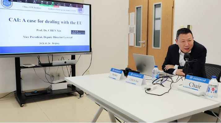 在主旨发言环节,中国社会科学院欧洲研究所副所长陈新研究员以《中欧全面投资协定》作为案例,深入探讨了新冠疫情背景下中国发展同国际社会其他主要行为体之间经济、贸易合作的机遇与困境,并从全球产业链发展与重塑的角度,就机制设置、法律框架等层面的困境和障碍进行了细致分析。
