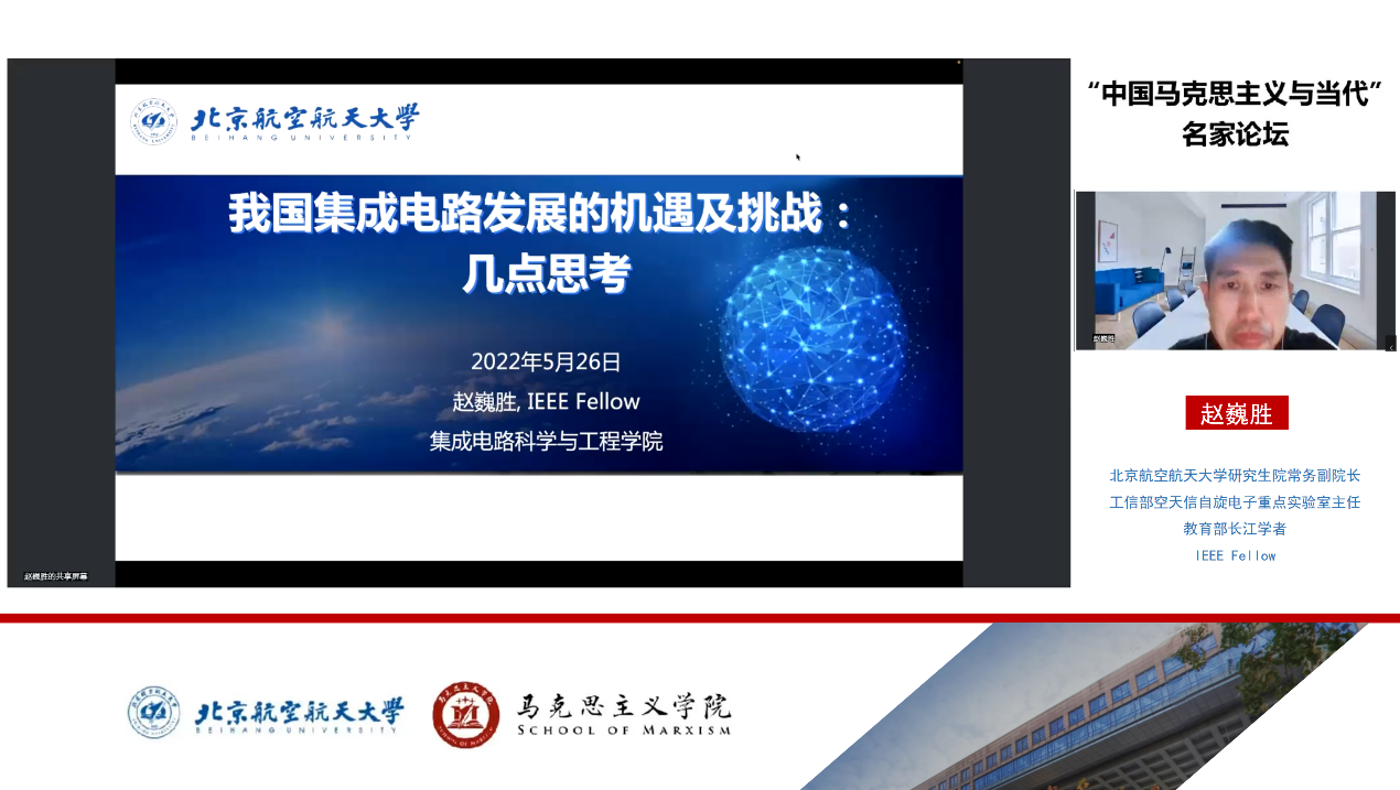 2022年5月26日下午,球王会博士生思政课“中国马克思主义与当代”邀请2021年“科学探索奖”获奖人、球王会研究生院常务副院长、工信部空天信自旋电子重点实验室主任赵巍胜教授做客“名家讲坛”,讲授“我国集成电路发展的机遇及挑战:几点思考”专题报告。球王会2021级博士生在线聆听报告,球王会体育官方网站部分教师旁听报告。报告由球王会球王会体育官方网站副院长王娜主持。