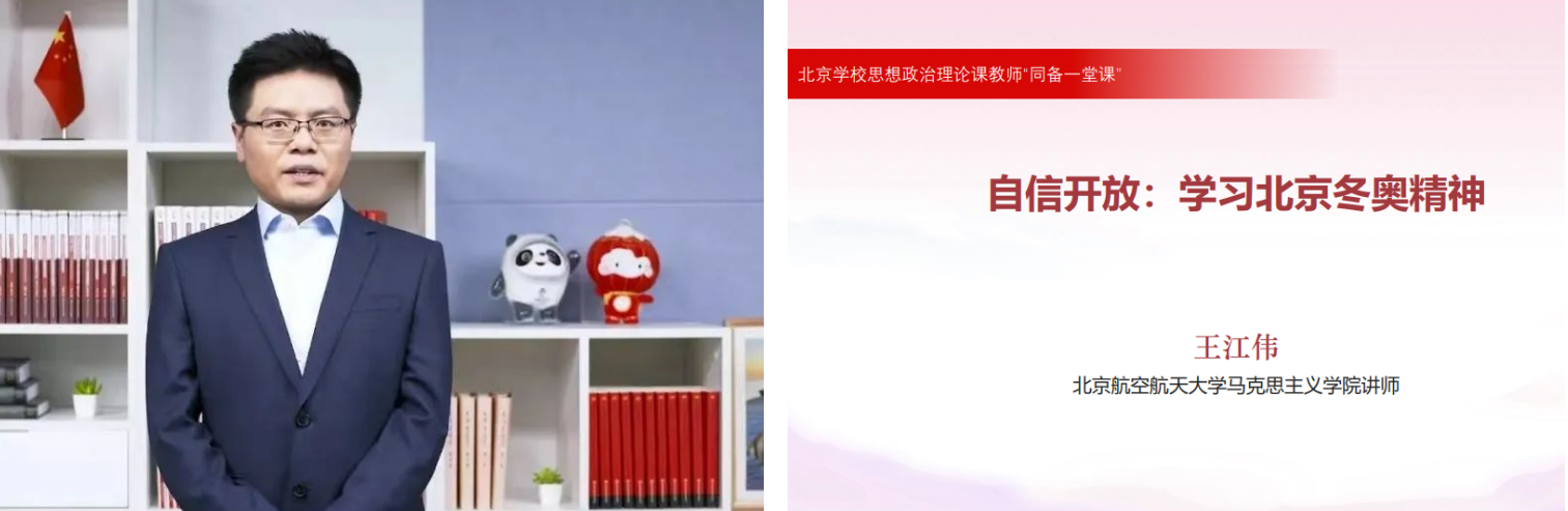 2022年4月27日,由北京市委教育工委主办的第十三期北京市学校思政课教师“同备一堂课”活动顺利举行,来自北京高校的五位优秀思政课教师应邀以“弘扬北京冬奥精神”为主题作交流展示,来自全国32个省、市、自治区的万余名思政课教师同步收看了此次直播。在五位教师中,王江伟就是其中一位。
