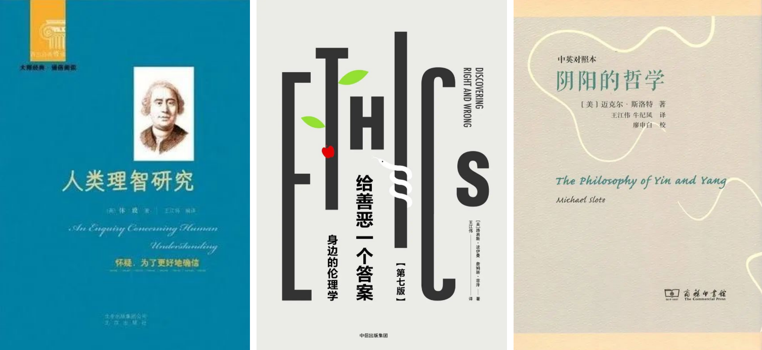 王江伟出版3部译著,由左到右依次为:《人类理智研究》(北京出版社,2012);《给善恶一个答案:身边的伦理学》(中信出版社,2017) ;《阴阳的哲学》(商务印书馆,2018)
