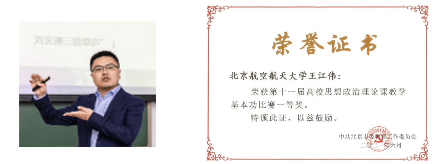 左:王江伟参加北京高校第十一届思政课教学基本功比赛;右:王江伟获北京高校第十一届思政课教学基本功比赛一等奖