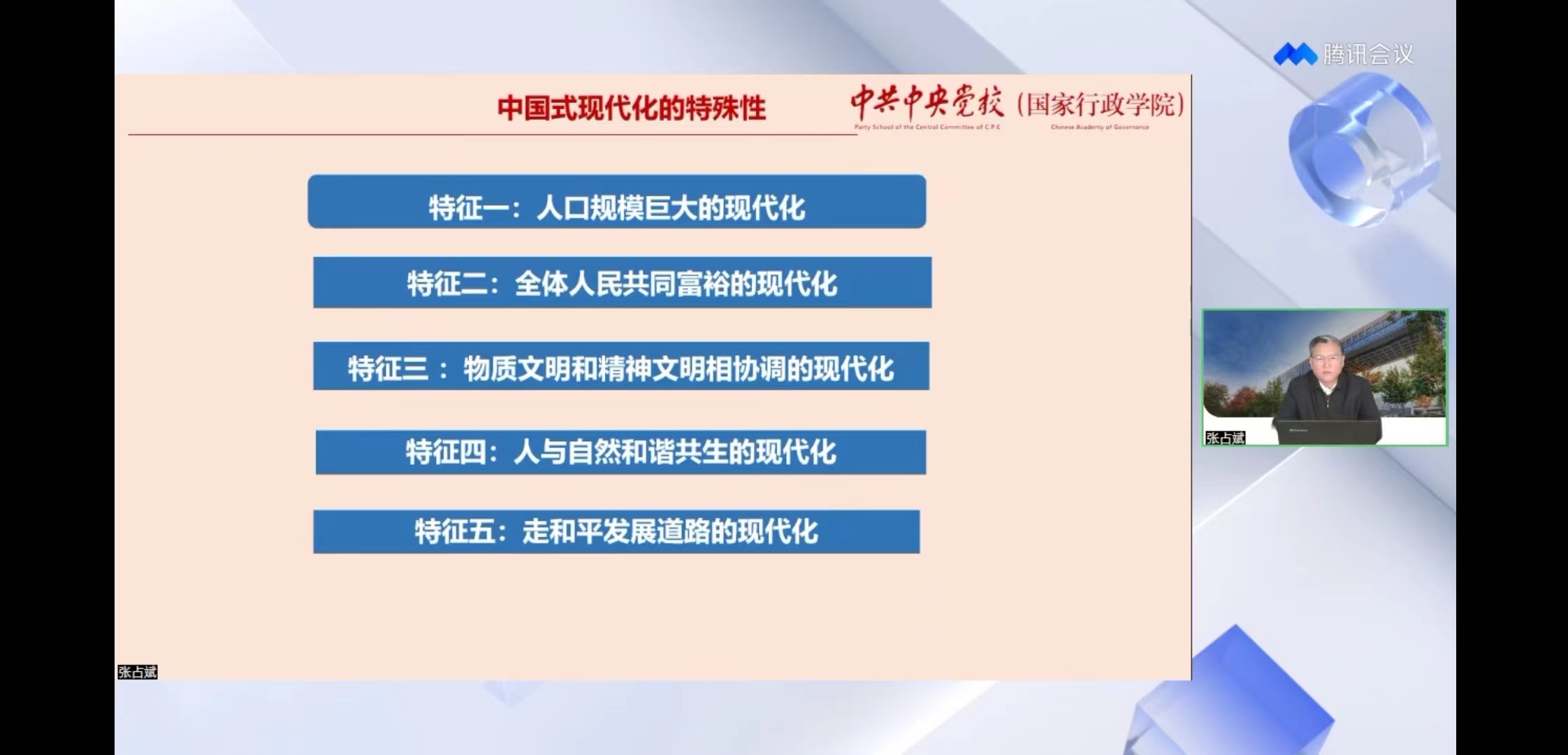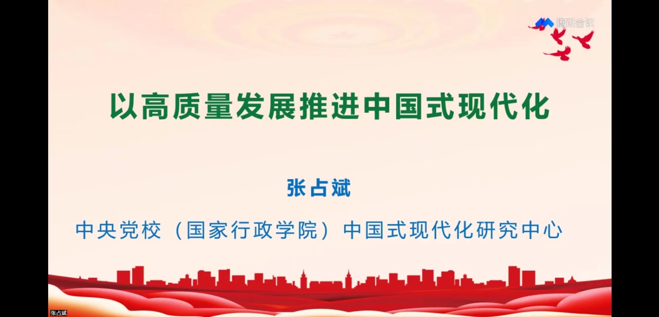 2023年12月20日上午,球王会体育官方网站邀请中共中央党校(国家行政学院)中国式现代化研究中心主任张占斌教授走进球王会思政课课堂,作《以高质量发展推进中国式现代化》专题报告。报告采取“腾讯会议+直播”的形式进行,球王会2021级、2022级和2023级本科生、马克思主义学院部分师生共同聆听报告。球王会体育官方网站党委书记高宁主持报告会。