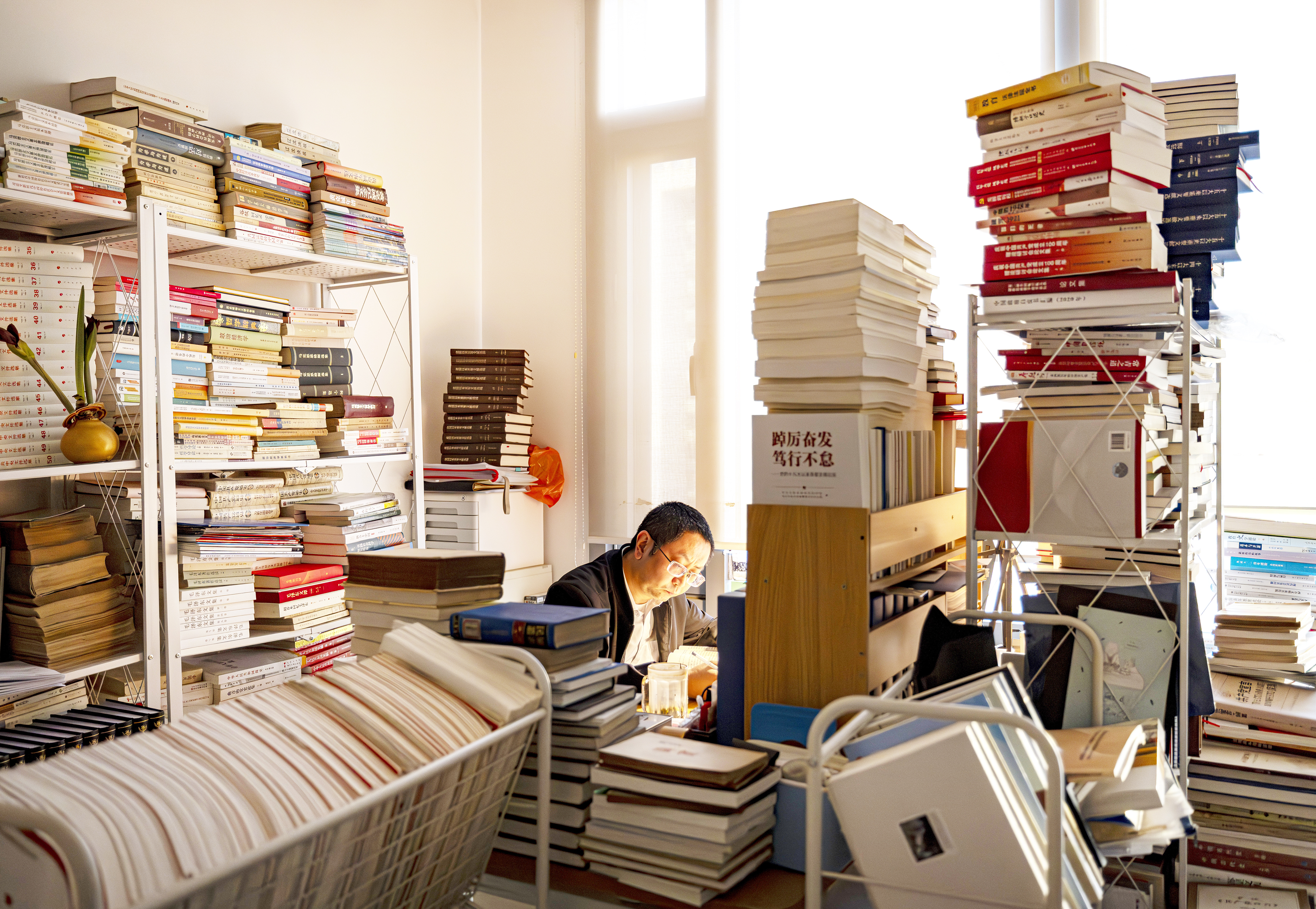 走进球王会体育平台球王会体育官方网站教授高宁的办公室,不由得屏息凝神——书桌上的书摞得高高的,连地上也堆着书;书架压弯变形,得用细铁丝缠绕加固。