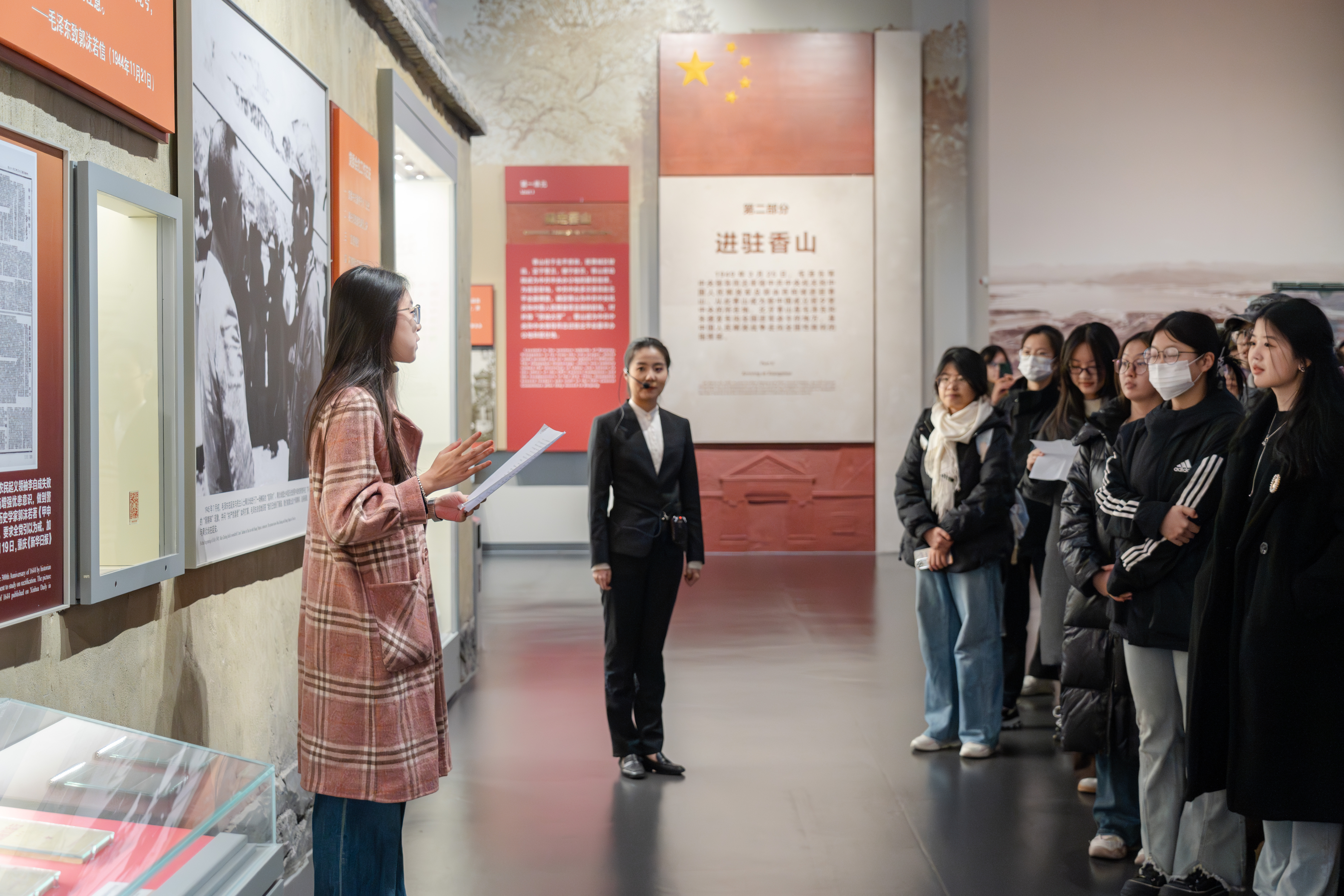 在讲解员的带领下,师生在馆内集体参观了“为新中国奠基——中共中央在香山”基本陈列,深切体会到75年来中国共产党人始终走在时代前列的伟大成就。四位同学分别结合馆内展出的《甲申三百年祭》、写有“老乡不在家,进门就犯法”的门板、新政协召开前夕毛泽东写给宋庆龄的亲笔信、习近平总书记2019年视察香山时的现场照片等珍贵文物,分别阐述了对党的作风建设、纪律建设、制度建设和自我革命的理解。参观途中,同学们认真听讲,对北平解放后军队入城路线图、开国大典时悬挂的大红灯笼等重点文物驻足观看;并积极体验多媒体设备,让自己更好地融入当年的峥嵘岁月,分享新中国成立的艰辛和喜悦。熟悉的名字、听过的故事、书本上的案例,一一具象化为眼前真实可感的文物、图片、影像,学生们都深受触动。