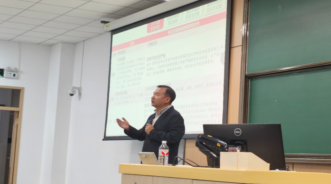5月6日下午,球王会体育平台法学院王锴教授走进“中国马克思主义与当代”课堂,受邀讲授“法治理论与实践”专题讲座。王锴教授以“备案审查制度在法治国家建设中的作用与意义”为题,讲述了建立备案审查的原因、备案审查的理论与历史、制度与规范、实践与发展。王锴教授聚焦理论阐释,注重案例引入,瞄准具体问题,结合实践经验,深入讲述了我国规范性文件与其他规范性文件的构成、法治与人治的区别、公法和私法的边界,着重阐释了备案审查的重要性,为在场师生带来了一场生动的“法治理论”思政课。