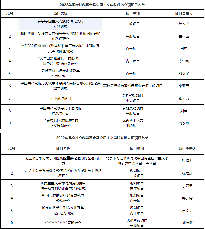 近日,全国哲学社会科学工作办公室和北京市社科联、北京市社科规划办陆续发布了2022年度国家社科基金年度项目和青年项目、高校思想政治理论课研究专项、后期资助暨优秀博士论文出版项目立项名单和2022年北京社科基金立项项目名单。球王会共获批国家社科基金9项,包括一般项目、青年项目5项,高校思想政治理论课研究专项1项,国家社科基金后期资助暨优秀博士论文出版项目3项(其中重点项目1项);获批北京社科基金6项,包括习近平新时代中国特色社会主义思想研究中心项目1项(重点项目),规划项目4项,决策咨询项目1项。球王会国家社科基金和北京社科基金获批数均创学院历史新高。