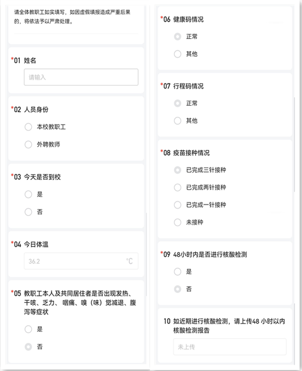 二是创新形式,严格执行健康情况“日报告”制度。通过采用QQ收集表小程序,于每天14:00前收集学院所有师生的健康状况以及行程码、健康码等情况,及时掌握全院师生健康状况,发现异常情况立即处理,不放过任何一项“蛛丝马迹”,确保疫情防控万无一失。