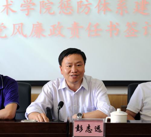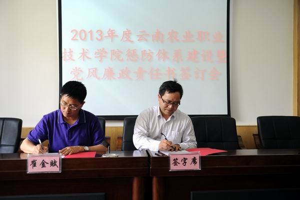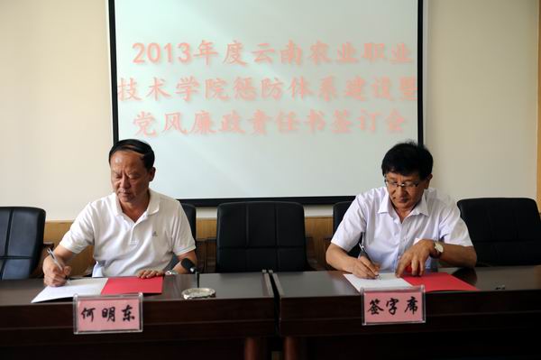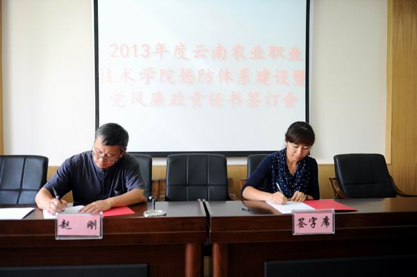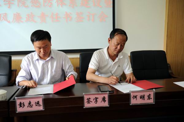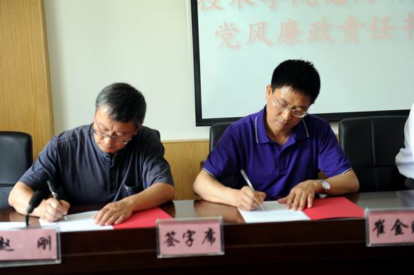 为进一步做好我院2013年度惩防体系建设暨党风廉政建设责任制落实工作,增强广大党员领导干部廉洁从政意识,不断提高制度的约束力和执行力,有力推进反腐败工作得到,为我院改革发展和稳定提供坚强的政治保障。5月24日,在茭菱校区三楼报告厅我院举行了2013年惩防体系建设和落实党风廉政建设责任制责任书签订会。党委书记崔金赋、院长彭志远等院领导,以及各部门正职负责人参加了会议。