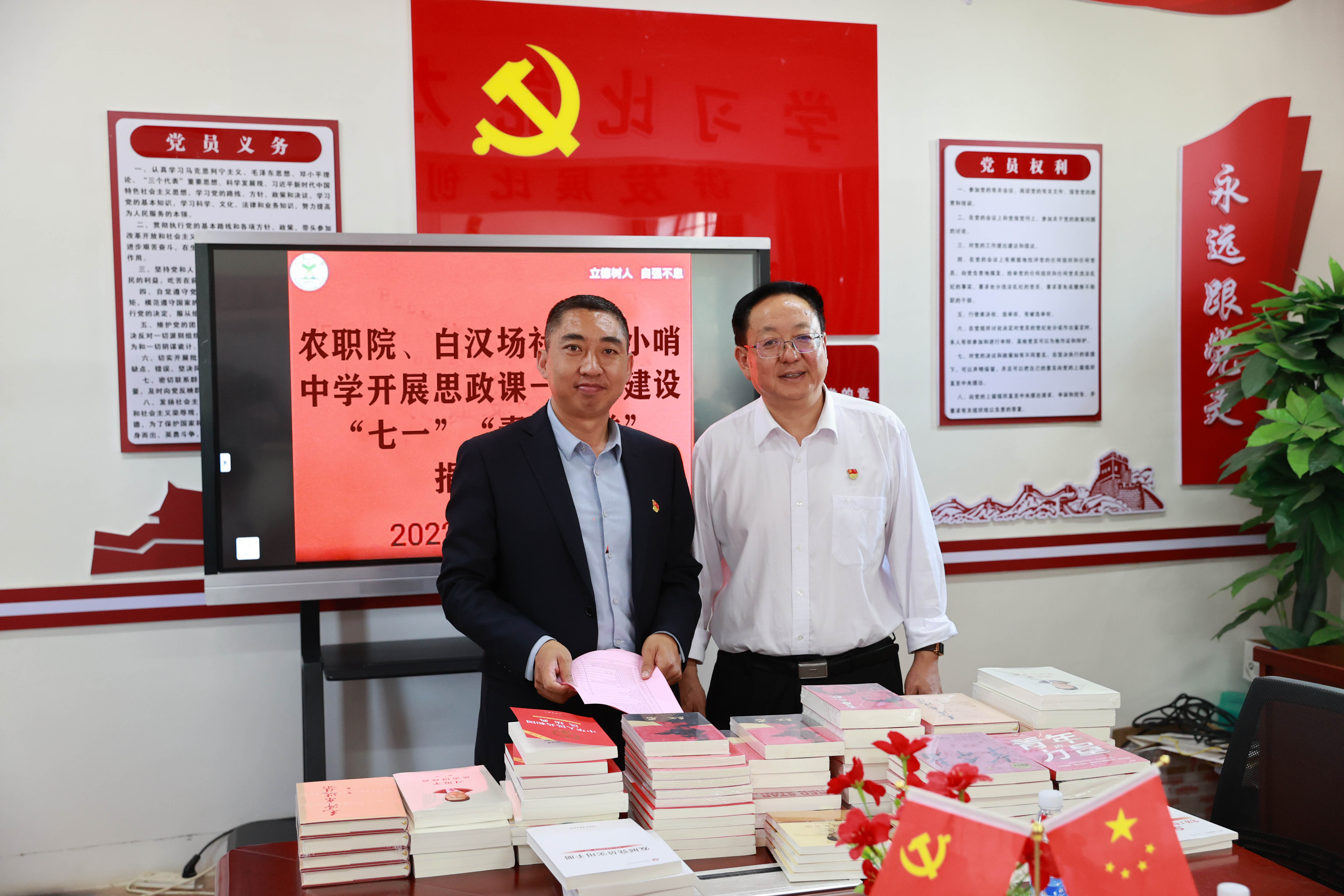 座谈会上,学院党委书记文俊同志表示,在“七一”之际,学院党委联合白汉场社区到小哨中学,以座谈交流、捐赠图书等形式,共同庆祝中国共产党成立101周年,共商大中小学开展思政课一体化建设等合作意向,对共同促进党建带社建、校校合作等方面具有重要的意义。文书记指出,一是小哨中学承担着小哨片区基础教育的重要责任,在服务社区和社会家庭、做好思政课程建设为中学生“扣好第一粒扣子”、为高校输送优秀学生等方面作出了很多的贡献。后期两校加强合作,实现学生的思想政治教育从小学、中学、大学一体化推进。二是农职院一直致力于小哨片区的整体发展,今后将牵头推进构建“白汉场小学-小哨中学-农职学院”思政课一体化建设的链条,与2所中小学携手共进,共同为大中小学生树立坚定的理想信念而努力,切实落实好党的教育方针和“立德树人”根本任务。三是学院将积极主动加强与小哨中学、白汉场小学的多方合作,让马克思主义学院党总支部与2所学校的基层党组织结对共建,持续强化大中小学校间思政课教师间的学习交流,开展党建“手拉手”、思政课现场观摩、劳动实践基地调研互动等活动,把开展思政课一体化建设落到实处。四是白汉场社区在小哨片区发挥着桥梁纽带的重要作用,用心用情服务于驻地各单位,特别对农职院“双报到双服务双报告”工作、校园安全等方面给予了较大的支持和帮助。希望在下一步的工作中,白汉场社区继续发挥党建引领和政府职能作用,以开展“双报到双服务双报告”“我为群众办实事”等形式,带动驻地单位充分发挥特色、共联共建,积极参与社区建设,实现优质资源共通共享,共同打造示范优质和谐社区。