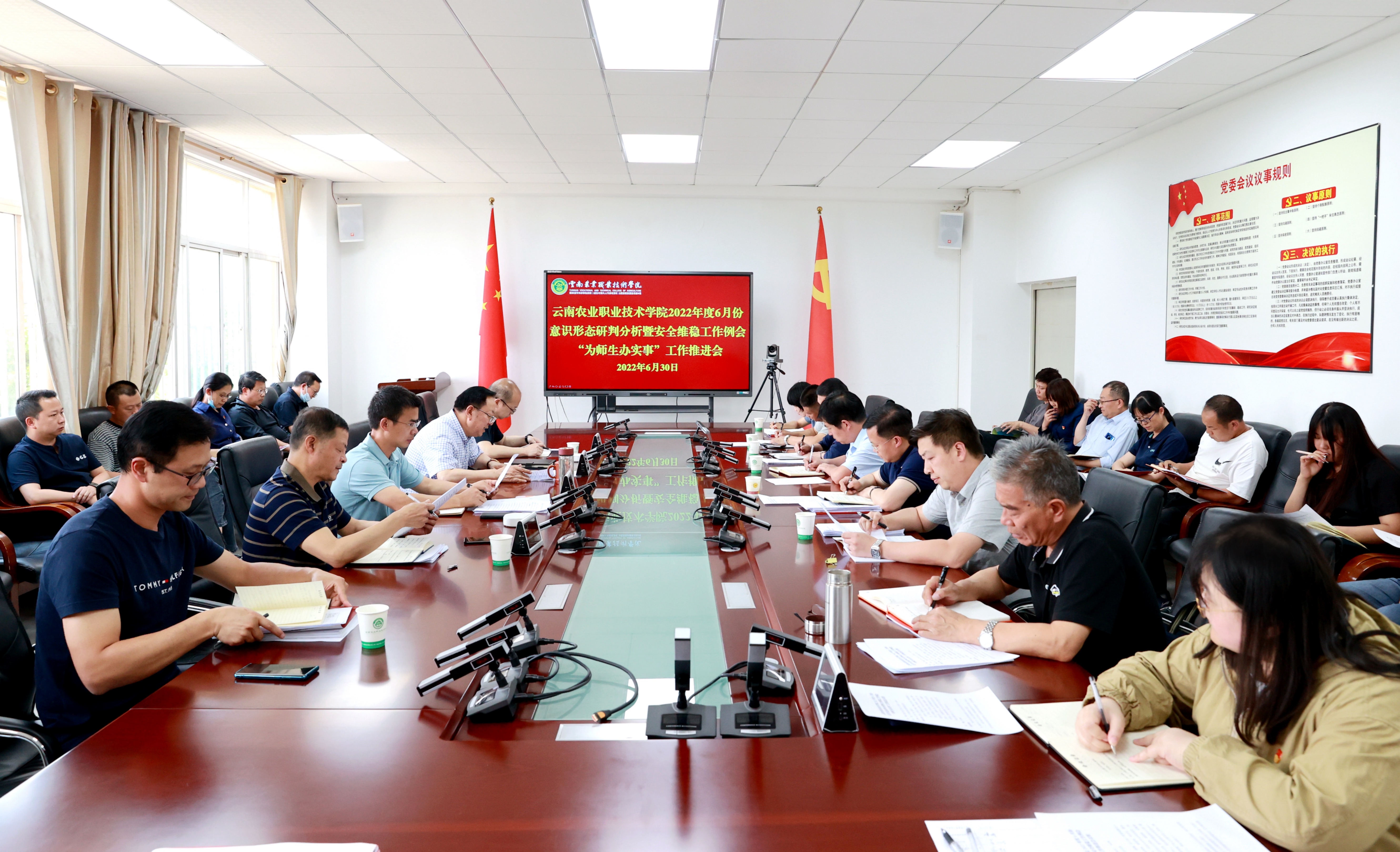 通知中心6月30日下午,学院在小哨校区综合楼四楼会议室召开2022年6月份意识研判分析暨安全维稳工作例会、“为师生办实事”工作推进会,党委书记文俊、党委副书记伍学龙、副院长杨波、雷衡等学院党政领导出席会议,各相关职能部门、各二级学院主要负责人参加会议,会议由副院长雷衡主持。
