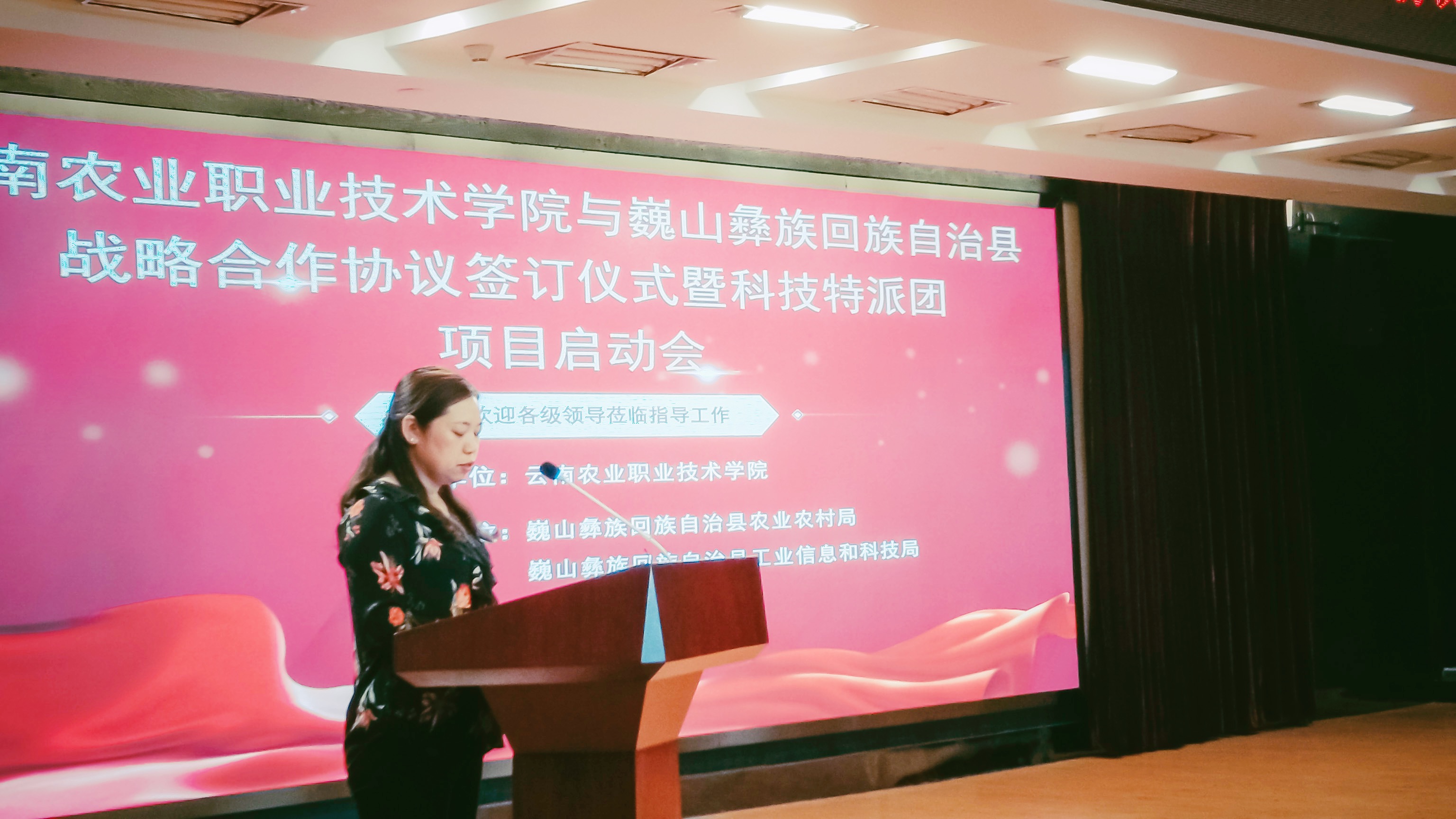 学院科技与对外交流合作处副处长、科技特派团项目负责人刘丽仙对项目的成员结构、项目目标、实施计划、经费来源等情况进行了介绍,并代表科技特派团全体成员作出郑重承诺,将凝聚各方资源优势,围绕巍山县肉牛产业发展实际问题进行攻关,有效促进巍山肉牛产业发展。
