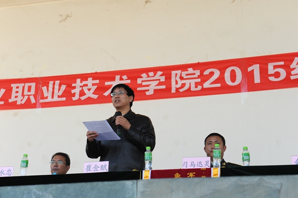 党委书记、军训团政委崔金赋为本次新生军训作了总结讲话。崔书记代表学校党委向圆满完成军训任务的官兵和2015级全体新生及带队教师表示热烈的祝贺!他表示,在今后几年里,还有很多专业学习正等待着新生们去完成。并提出几点希望:一是希望同学们继承和发扬顽强拼搏的优秀品格,严于律己,艰苦奋斗。二是希望同学们继承和发扬农职精神,脚踏实地,崇尚奉献。三是希望同学们继承和发扬勇于创新,勤于实践的精神。