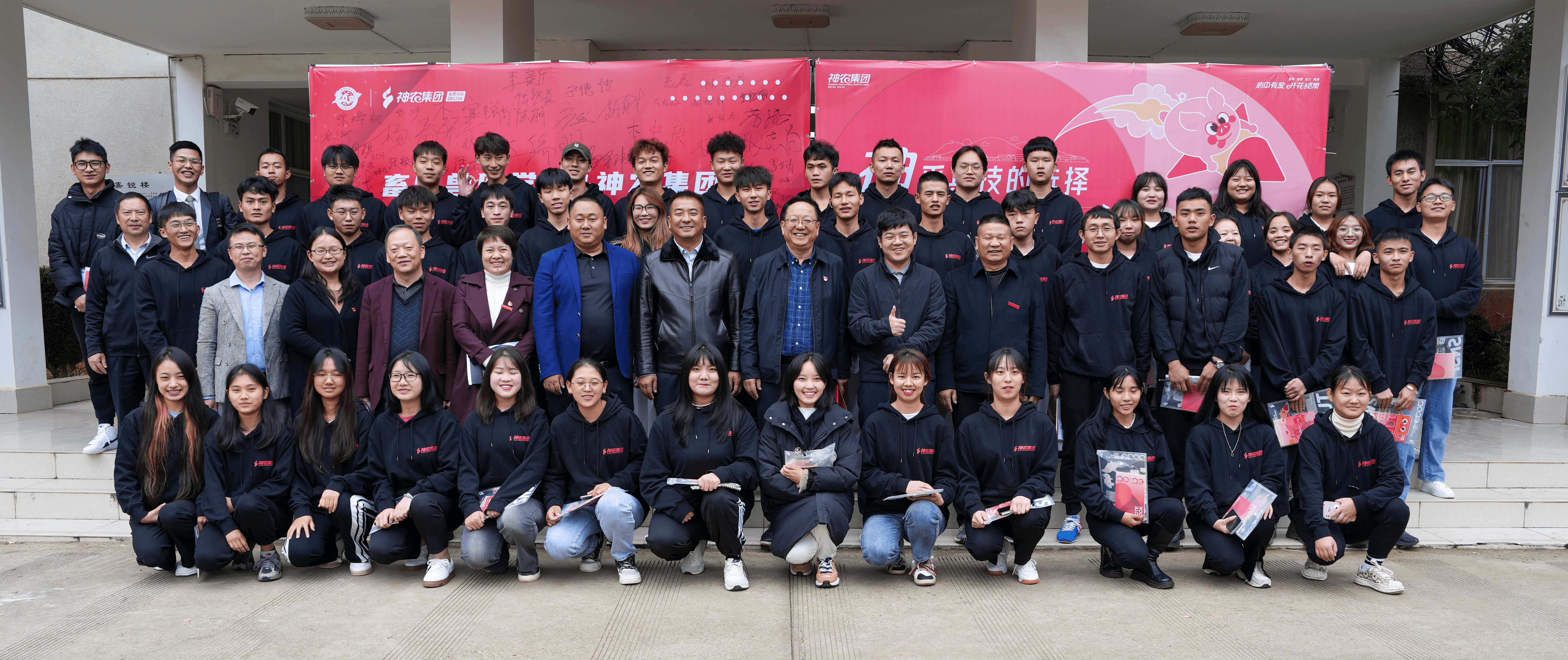 云南神农集团总裁助理兼人力资源中心总监何昕阳、养殖事业部兽医总监李明等一行;我院党委书记文俊、副院长苏华伟及畜牧兽医学院领导班子;“神农班”学生、畜牧兽医学院大一新生参加此次开班仪式。
