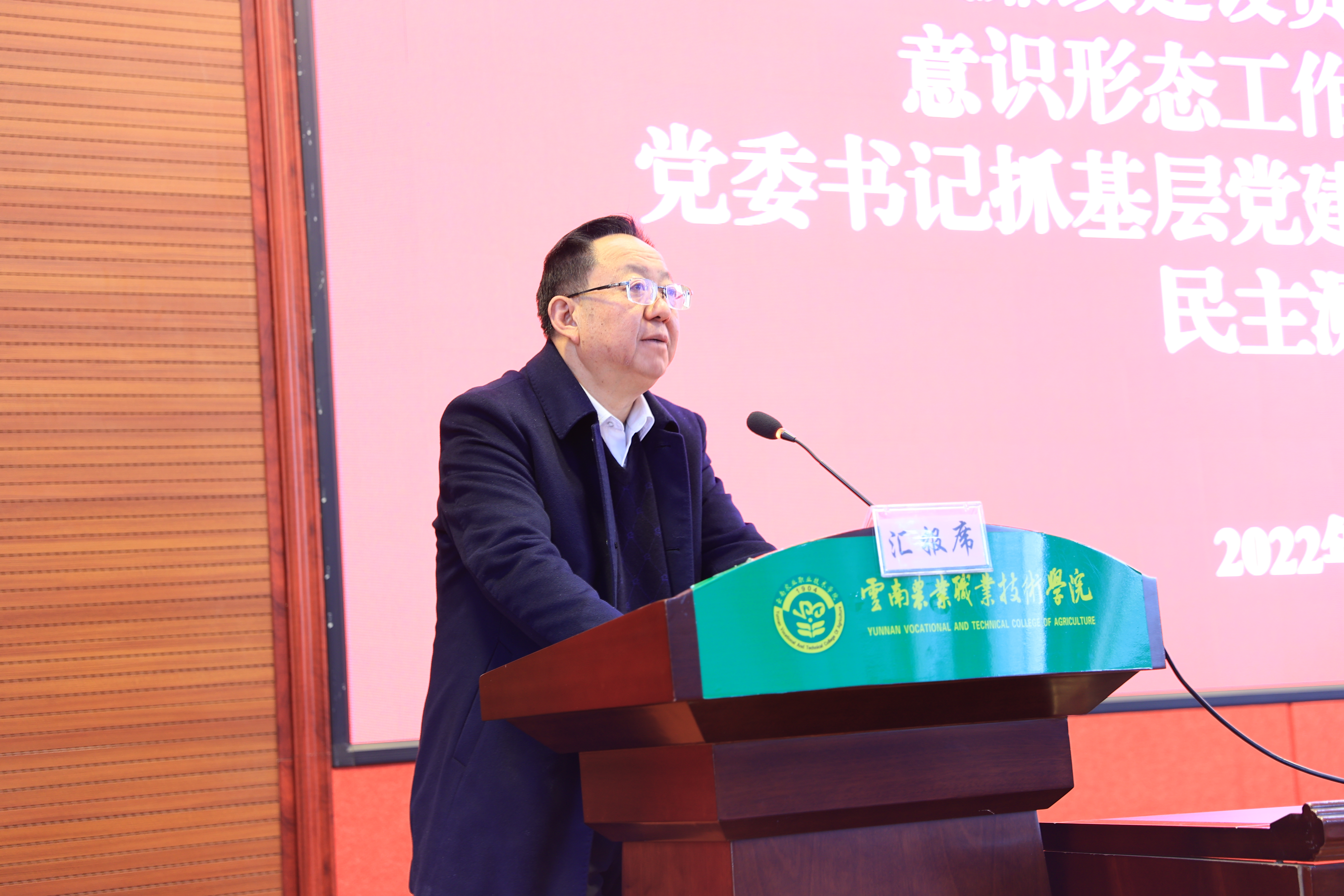 会上,省委教育工委考核组和全体参会人员听取了党委书记文俊代表学院领导班子所作的2022年度工作报告和2022年度落实党风廉政建设责任制工作情况报告、校领导(含享受待遇领导干部)现场或书面所作的述职报告和述责述廉报告,组织参会人员对2022年度领导班子工作目标任务、学校领导班子和领导干部履职情况、落实党风廉政建设责任制和党政领导干部述责述廉情况、选人用人工作和新提拔干部进行了民主测评。文俊在年度工作报告中指出,2022年,学院在省委、省政府的坚强领导和省委教育工委、省教育厅的大力支持下,坚持强化政治统领,坚决做到“两个维护”;坚持落实意识形态责任,扎实推进思想政治工作;坚持压实工作责任,推动基层党建提质增效;坚持全面从严治党,严格落实党风廉政建设责任;坚持稳中求进、真抓实干,全面推进学院高质量发展。他表示,在今后工作中,学院党委将继续深入学习宣传贯彻习近平新时代中国特色社会主义思想和党的二十大精神,牢牢把握社会主义办学方向,加强干部队伍建设,着力完善“大思政”工作格局,着力推进治理体系和治理能力现代化,着力推进专业群条件建设达标工程,着力提升专业社会服务能力,主动服务和融入乡村振兴战略,凝心聚力,踔厉奋发,努力实现学院高质量发展,为全面实施乡村振兴战略和云南高原特色农业建设做出新的更大贡献。