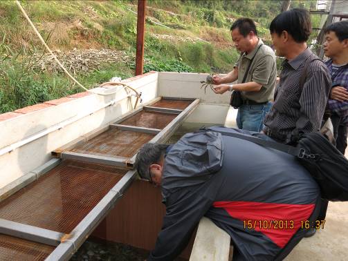 王武教授一行在云南省渔业科学院贺伟平所长的陪同下,对养殖场进行了实地考察。听取了严晖教授介绍实训基地的情况,亲自到蟹池边了解大闸蟹生长情况。王武教授对沙朗大闸蟹养殖环境、水质及品质给予充分肯定,并针对问题提出了宝贵建议。一是加大水草的投喂量,种植依乐藻,认真落实“圈、粗、精”的技术措施,进一步提升大闸蟹品质;二是严把上市前的育肥关,在提高天然动物蛋白饲料含量的同时,投喂适当比例的紫薯和玉米等,提高优质蟹的产量;三是严把质量关,认真落实优质蟹的“五星级”标准——“肥、大、腥、鲜、甜”,打造好“沙朗大闸蟹”的品牌。