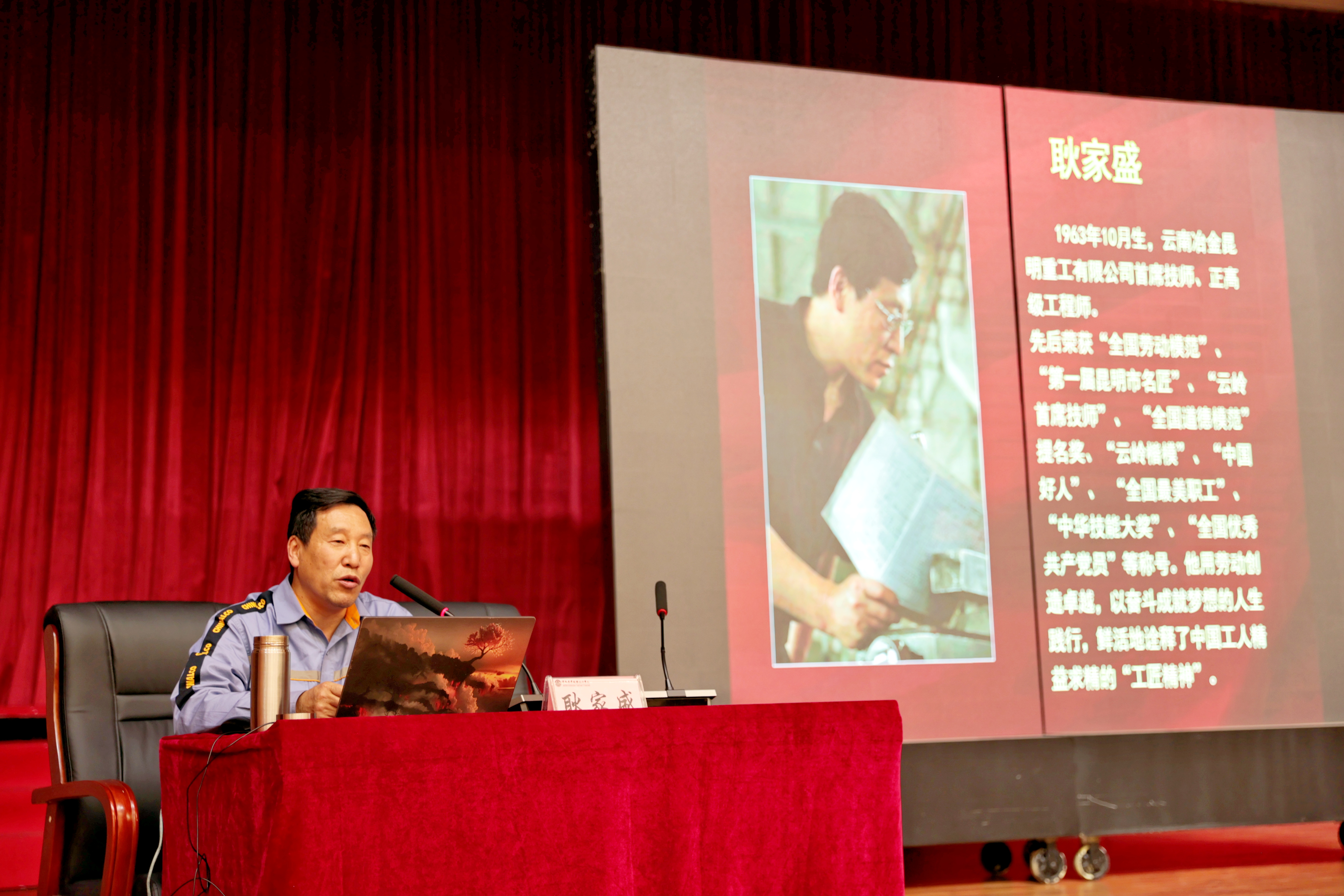 耿家盛以《感恩时代 不忘初心 技能报国》为题,用质朴的语言、鲜活的事例讲述了自己的成长成才之路,从技校毕业的油漆工到加工行业的“一把刀”,从一名学徒到一位“名匠”,耿家盛用几十年的执着与坚守诠释了工匠精神。作为一名60后的党员,耿家盛可以说是与改革共成长,切身感受到党的伟大成就,他表示,能够取得如今的成就,归功于伟大的时代、归功于伟大的党。耿家盛曾经3次到北京天安门观礼,受到党和国家领导人的亲切接见,他把党和国家给予的这份荣誉当成温暖,当作力量。耿家盛以个人经历勉励同学们“学历不是终点,能力才是终点”,“平凡的岗位也能创造不平凡的人生”,把最朴素的匠人情怀、最宝贵的敬业精神传递给同学们。