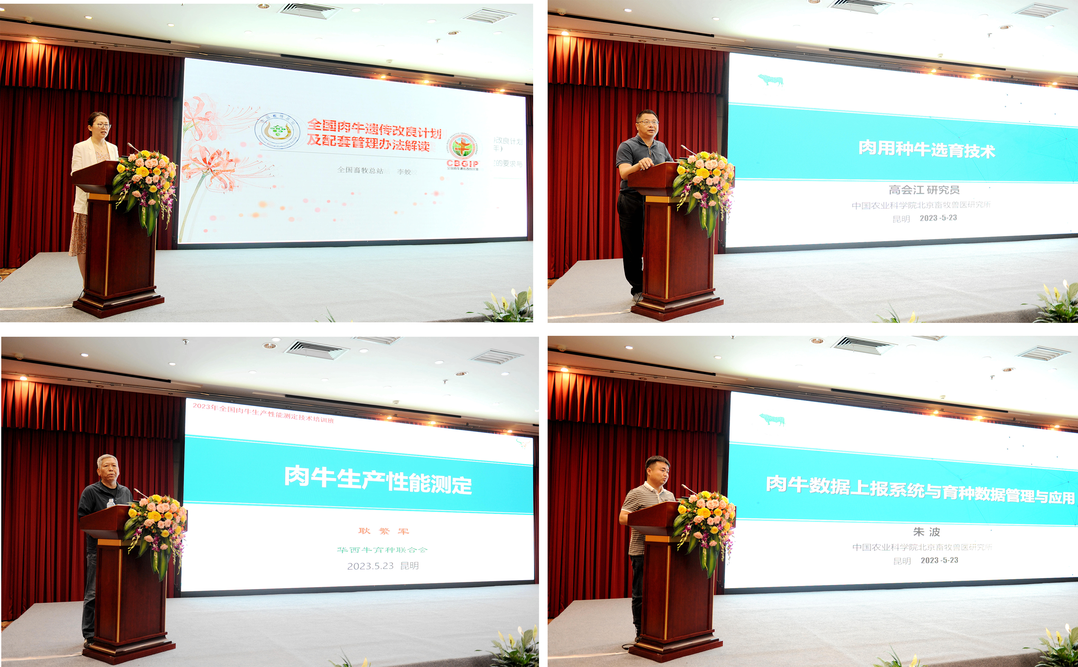会上,李姣高级畜牧师结合全国肉牛产业发展实际,对我国肉牛遗传改良方面的工作进行了全面总结。她指出,目前,我国肉牛育种核心群规模不断扩大,种牛生产性能测定与评估体系逐步规范,地方资源开发取得新突破,中央财政对肉牛产业的支持力度不断加大,企业扶优工作全面推进,肉牛种业振兴的作用将得到更大地发挥。赵志军副站长介绍了云南省肉牛产业现状。他指出,云南肉牛存栏量和出栏量均居全国第一,正从肉牛产业大省向强省转变,现有13个地方品种资源和1个云岭牛自主培育品种,5个国家级核心育种场。苏华伟副院长介绍了学院(云南省种畜繁育推广中心)的基本情况并指出,近年来,学院认真贯彻落实习近平总书记关于“强国必先强农,农强方能国强”指示精神,深入贯彻落实习近平总书记考察云南重要讲话精神,充分发挥种畜中心种质资源优势,助力云南乃至全国大力发展肉牛产业。学院将进一步实施好肉牛遗传改良计划,切实夯实肉牛种业基础,助推肉牛产业持续健康发展。