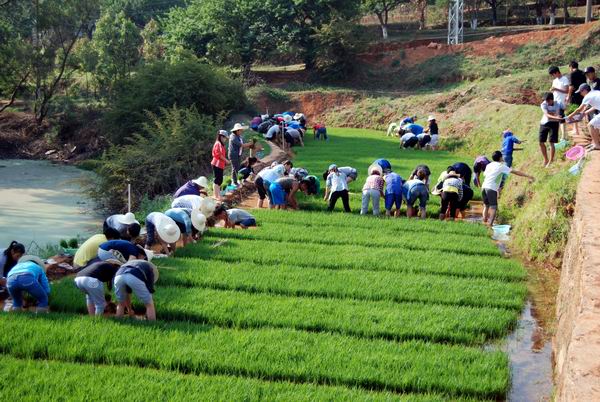 为更好地推广“粮食高产创建的科研与实践工作”,推动水稻科研项目的开展,同时推进相关专业实践教学的需求,园林与园艺学院开展了历时一天的水稻插秧活动。