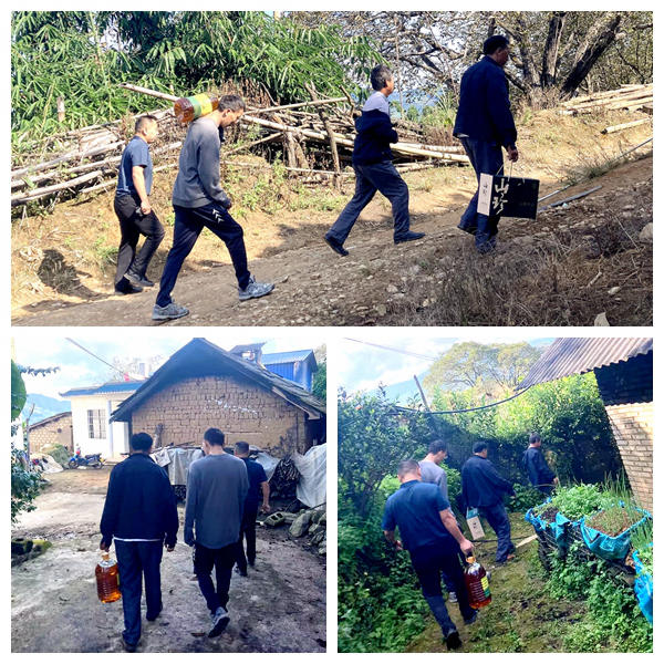 首先,驻村工作队的同志们来到老党员、老支书周关祥大爷的家中。周大爷今年已经七十有余,行动不便。见到驻村工作队的同志们,周大爷面露微笑,眼中透着感动。同志们为周大爷送上了一份精心准备的中秋礼包,里面装有蜂蜜、菌菇、木耳及一桶8.5升的食用油。工作队的同志们与周大爷热情交流,倾听他生活中的点点滴滴,传递着党和学院的关怀。