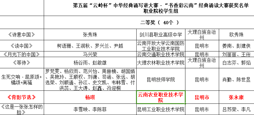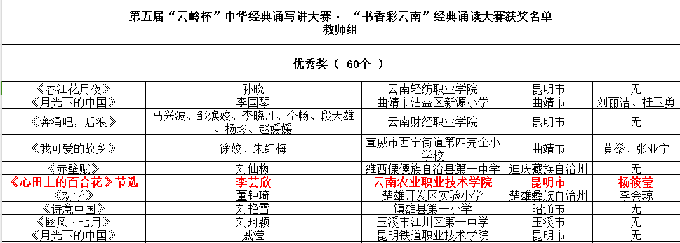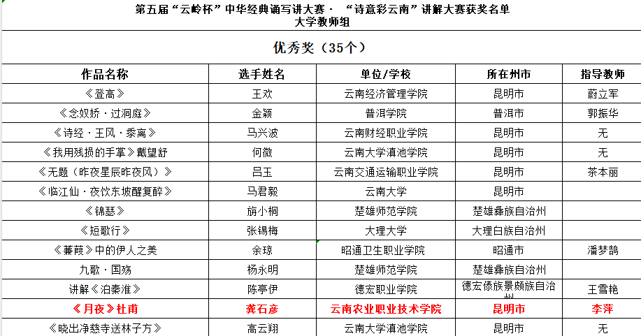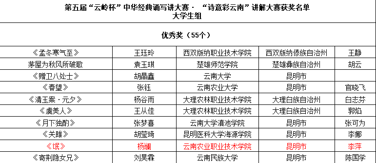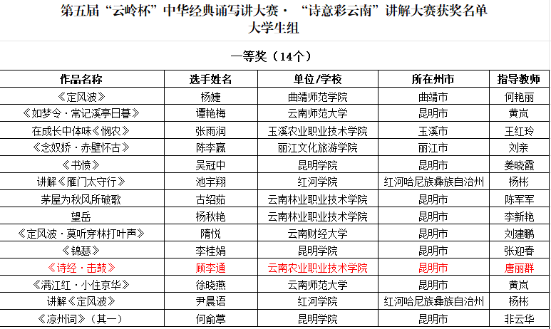 农学与园艺技术学院学生顾李通的作品《诗经·击鼓》荣获中华经典诵写讲大赛大学生组讲解类一等奖,其作品《我走在早晨的大路上》荣获大学生组诵读类二等奖;工程学院学生杨琪的作品《背影节选》荣获诵读类大学生组二等奖。李芸欣老师的作品《心田上的百合花》荣获教师组诵读类优秀奖、龚石彦老师的作品《月夜—杜甫》荣获教师组讲解类优秀奖、云安产业学院学生杨斓的作品《氓》荣获讲解类大学生组优秀奖。