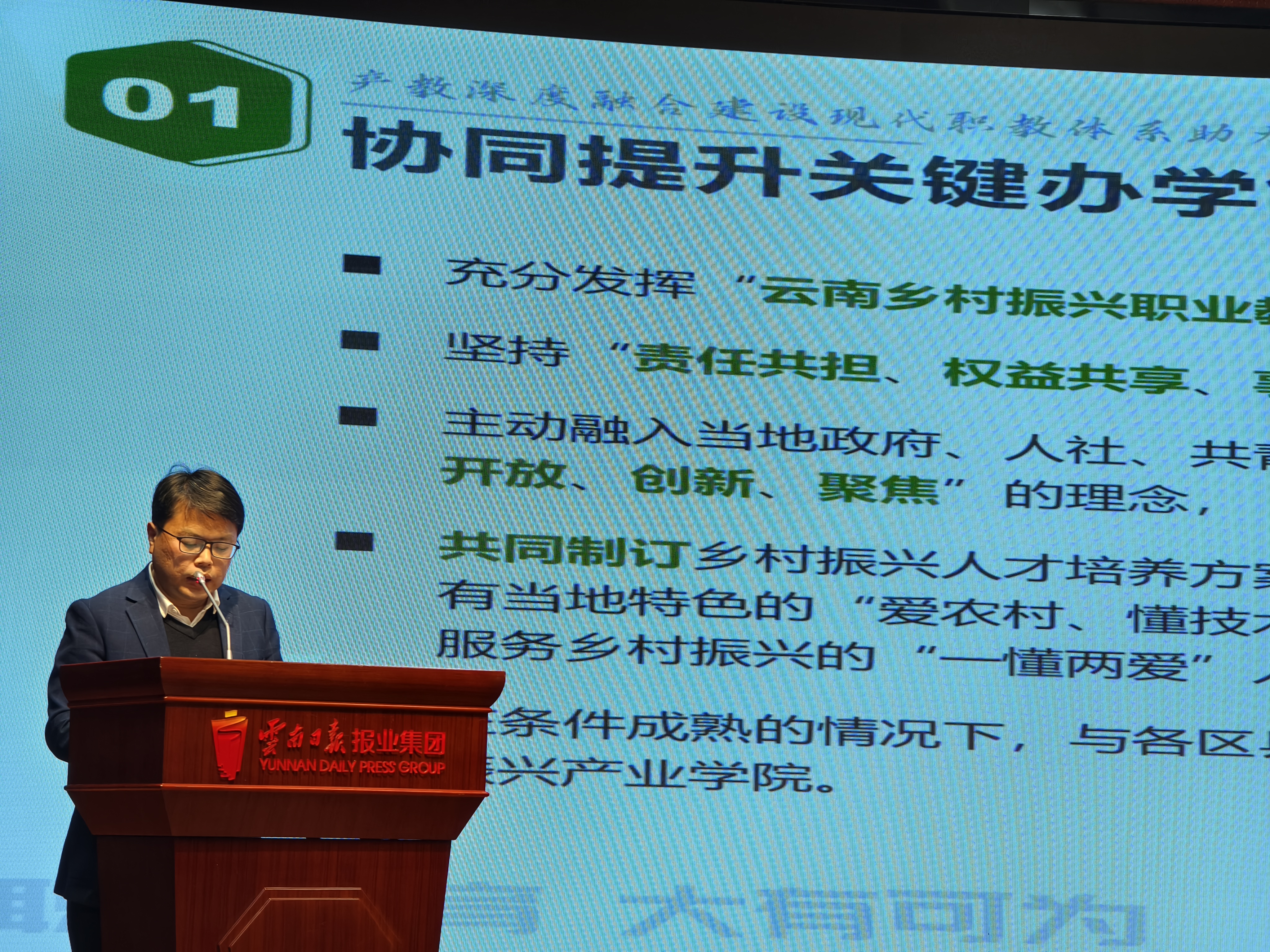 发布会上,陈太安院长作了“产教融合赋能乡村振兴”主题发言,简要介绍我院近120年的发展历程,分享了产教融合助力美丽休闲乡村建设的新理念、新模式和新实践,阐释了协同提升关键办学能力助力乡村振兴、协同拓宽学生成长通道助力乡村振兴等观点。陈太安院长提出,要充分发挥“云南乡村振兴职业教育集团”的作用,以其为纽带将更多中高职院校、科研机构、行业、企业联结起来。坚持“责任共担、权益共享、事业共创、多方共赢”的原则,充分对接当地龙头企业,主动融入农业农村人才综合培养体系,按照“多元、融合、开放、创新、聚焦”的理念,共同制订乡村振兴人才培养方案,共同开发乡村振兴人才教学标准和教育教学资源,共同研制具有当地特色的“爱农村、懂技术、善经营”高素质兴农人才评价体系,多通道、高标准、严要求培养服务乡村振兴的“一懂两爱”人才。陈太安院长表示,在条件成熟的情况下,希望与各州(市)、区(县)政府和中职学校合作共建“政府+高职+中职+企业”的乡村振兴产业学院。
