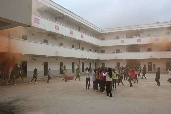 首先,空港大队李参谋对全国的火灾情况进行了介绍并强调了消防演练的重要性。随后,按照既定安排,工作人员在女生四合院宿舍楼楼内燃放消防烟雾,安全员指挥各层学生捂住口鼻有序迅速撤离到指定集合地点。空港大队沈队长就疏散演练中发现的问题进行点评。