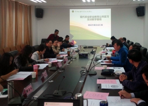 为使该项目建设科学合理,充分发挥现代农业职业教育公共实习实训基地的实践教学共享和社会服务的功能,规范使用资金,按照《云南省教育厅云南省财政厅关于“十二五期间”高职高专教学质量与教学改革工程的实施意见》(云教高﹝2012﹞2 号)及《云南省教育厅关于公布2014 年度云南省高等职业院校公共实习实训教学基地建设项目立项名单的通知》(云教高﹝2014﹞94号)要求,以昆明冶金高等专科学校校长王资教授为组长的七位专家组成的专家组,于2014年11月6日对学院“现代农业职业教育公共实习实训教学基地建设方案”进行论证。云南省教育厅司慧迎、朱超老师,省财政厅张宇老师,院长李永忠、副院长何明东、院长助理田应华、党院办主任金吉斌、教务处处长张江荣、计财处处长程春慧、教务处副处长兼实践教学指导中心主任李石友及各二级学院院长参与了论证会。