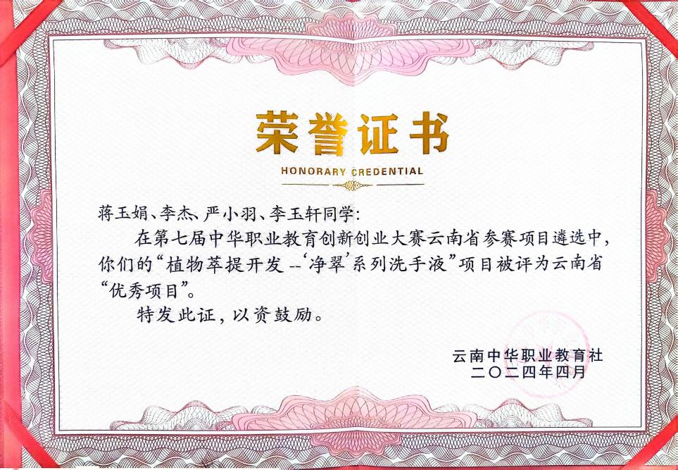 该项目由唐小涵、解芬老师精心指导,团队成员包括蒋玉娟、李杰、严小羽和李玉轩四位同学。项目以云南特色香料迷迭香及香叶天竺葵的开发利用为切入点打造洗手液产品,不仅体现了学院在创新创业教育方面的不懈努力,也充分展示了师生们勇于探索、敢于创新的精神风貌,同时彰显了植物萃提技术在日用品开发中的巨大潜力和市场前景。
