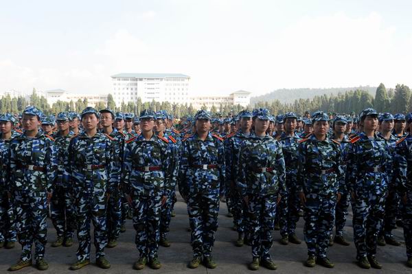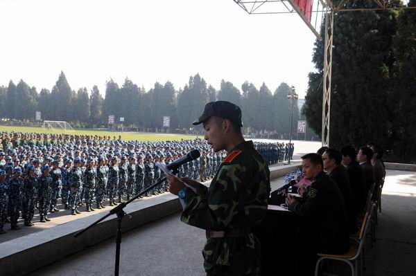 昆明民族干部学院一大队队长冯春队长为参训学生作了重要讲话。他首先介绍了昆明民族干部学院的悠久历史,和严明的军队作风。冯春队长在动员大会上指出军训对于当代大学生的重要性,强调军训对于参训学生来说是意志力的考验、是自信力的锤炼。相信经过半个月的严格、艰苦的训练,全体参训学员一定能够交出一份优秀的答卷。