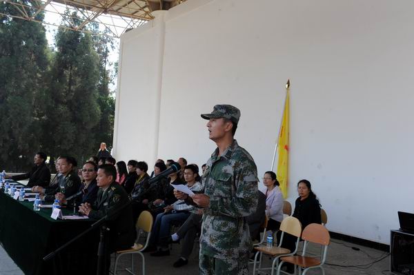昆明民族干部学院的教官代表宁政杰在讲话中表示,决心做到按照计划严格施训,做到科学管理、科学训练;不打骂、不体罚学生,做到以情带兵,以理服兵;在生活中,力尽所能关心、帮助每一位学生,和学生一道将各项工作做好;培养吃苦耐劳、团结协作、爱国奉献、顽强拼搏的作风,力争让每一位同学有所收获、有所的;保质保量地完成各项规定的任务,以优异的成绩向领导和老师汇报。