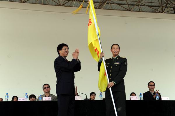 党委书记崔金赋为军训团授旗,把学院校旗授予昆明民族干部培训学院一大队冯春队长。