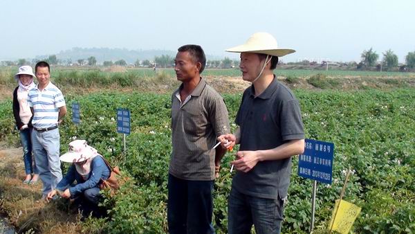 4月26日,云南省现代农业马铃薯产业技术体系首席专家杨艳丽教授带队,产业经济研究室岗位专家张德亮教授、栽培技术研究室岗位专家海梅荣副教授等一行8人,就石屏冬马铃薯试验站工作和冬马铃薯示范基地的生产情况、病虫害发生情况进行现场调研指导。在sunbet集团中国官网入口马铃薯试验站站长王孟宇、石屏农业与科技局李红艳副局长、石屏县异龙镇李渊副镇长陪同下,调研指导组深入石屏县高家湾、豆地湾村委会冬马铃薯生产基地,现场检查试验站工作,与农户进行交流,全面指导石屏冬马铃薯生产。