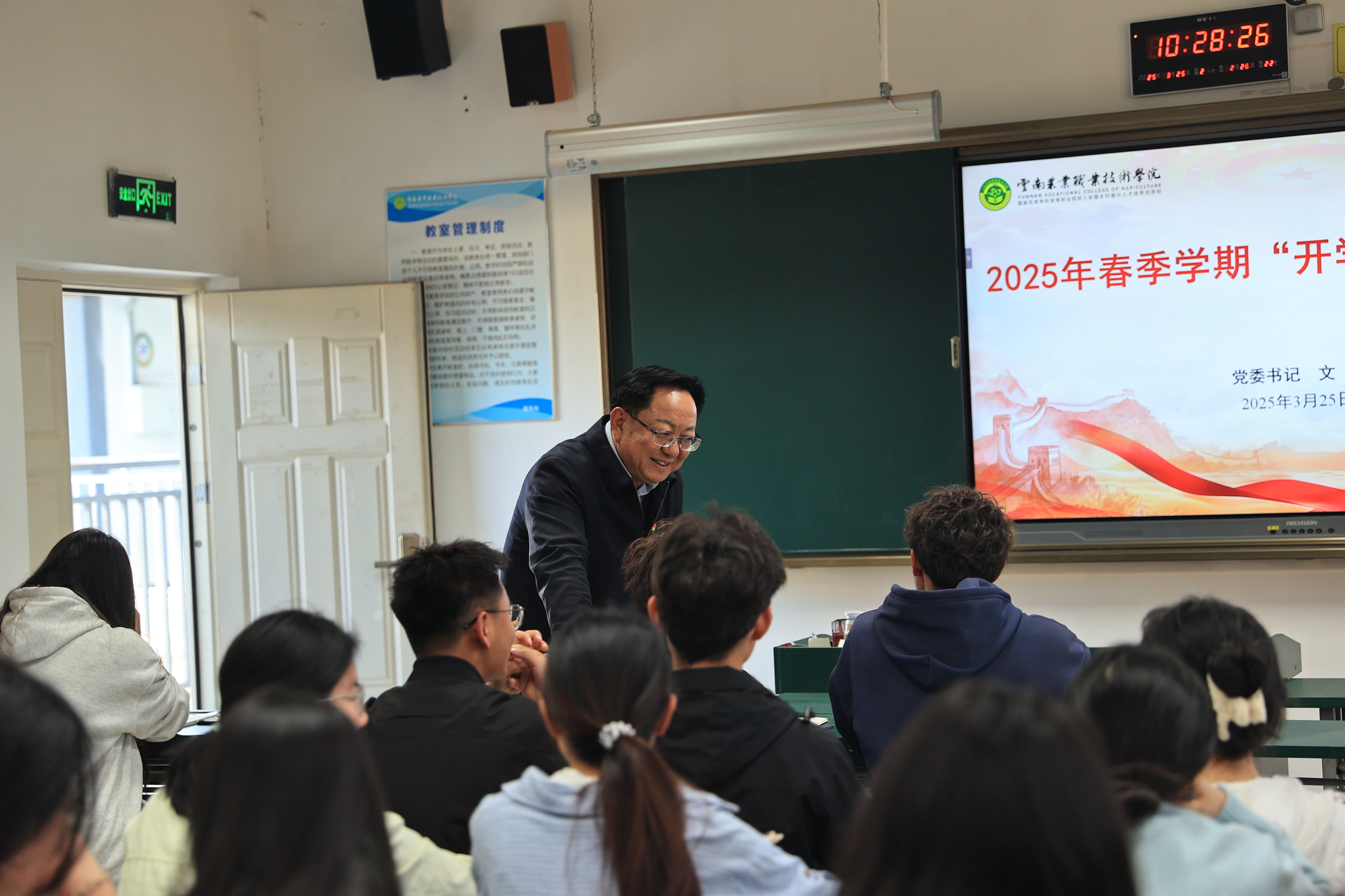 课上,文俊书记紧扣“人才培育”与“高原特色农业”双核心,深入解析中央一号文件关于乡村人才振兴的部署要求,结合2025年全国两会高质量发展主线,系统阐释《教育强国建设规划纲要》中现代职业教育体系建设目标。特别聚焦习近平总书记3次考察云南时对发展高原特色农业的重要指示,从让这一“美丽产业”成为造福群众的“幸福产业”,到丽江古城游客十分热情地向习近平总书记问好:“能不能邀请您来喝杯咖啡?”让同学深深感受到高原特色农业发展势在必行,职业教育大有可为。