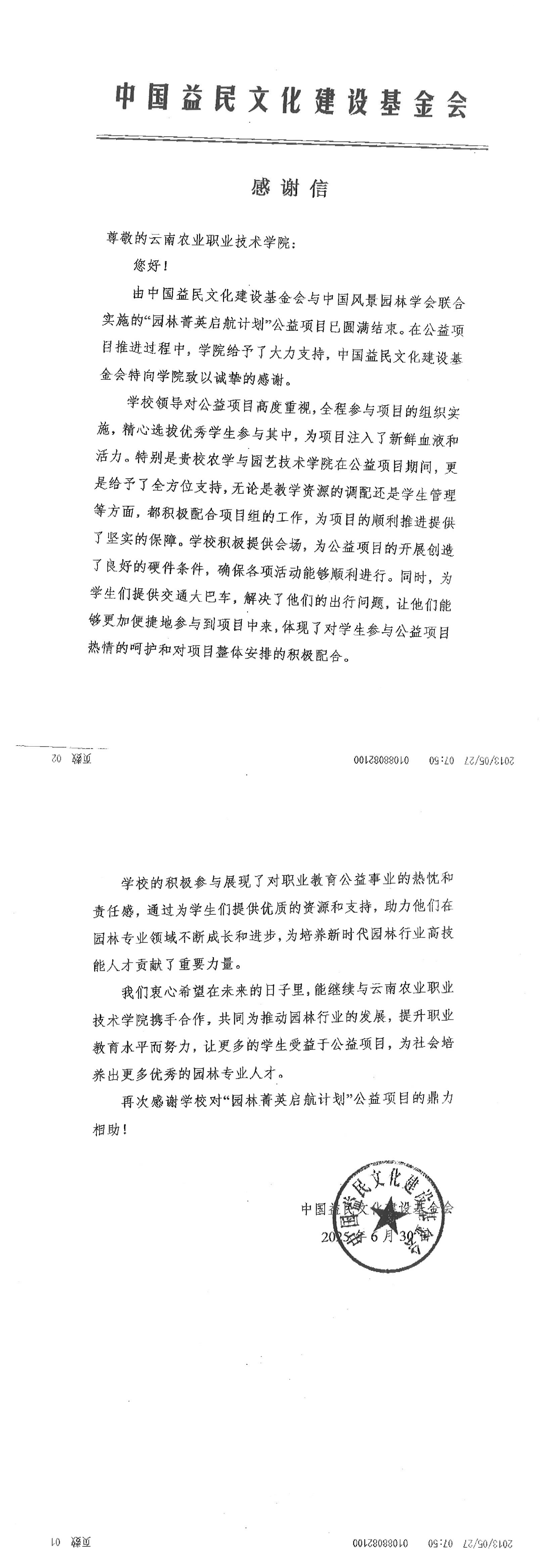 通知中心近日,sunbet官网收到中国益民文化建设基金会发来的感谢信。信中对农学与园艺技术学院牵头实施的“园林菁英启航计划”第一年工作给予高度肯定,字里行间满是对项目成效的认可与对边疆职业教育的关切,让全院师生备受鼓舞。
