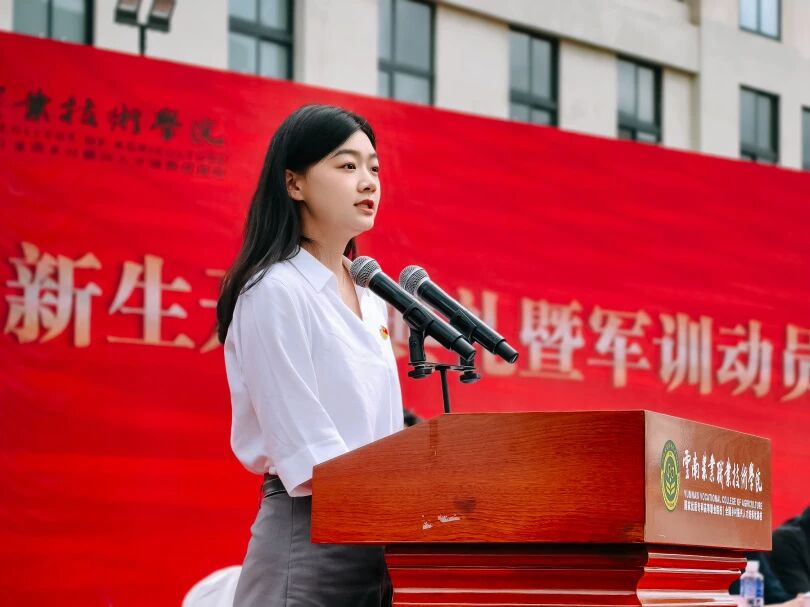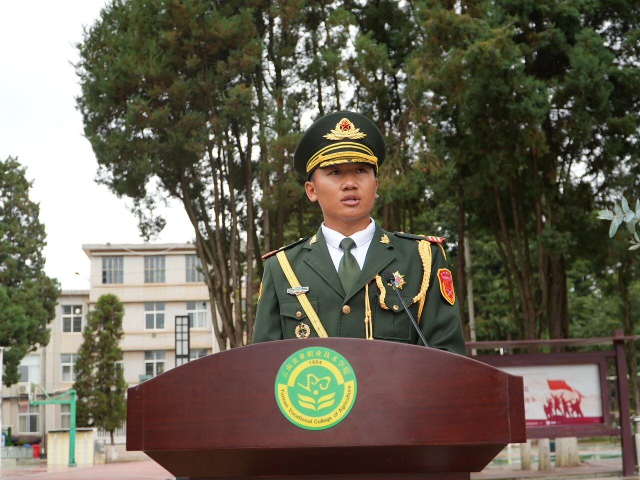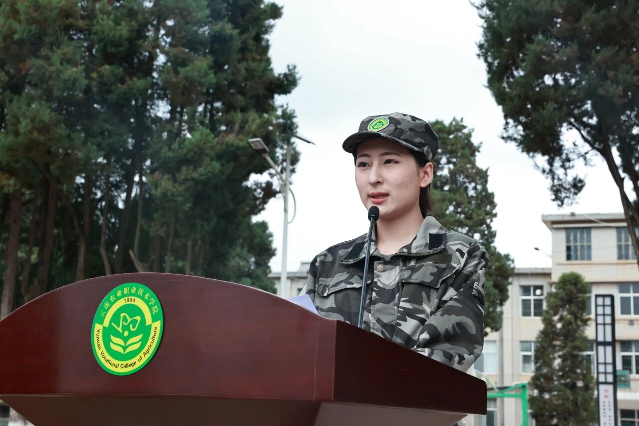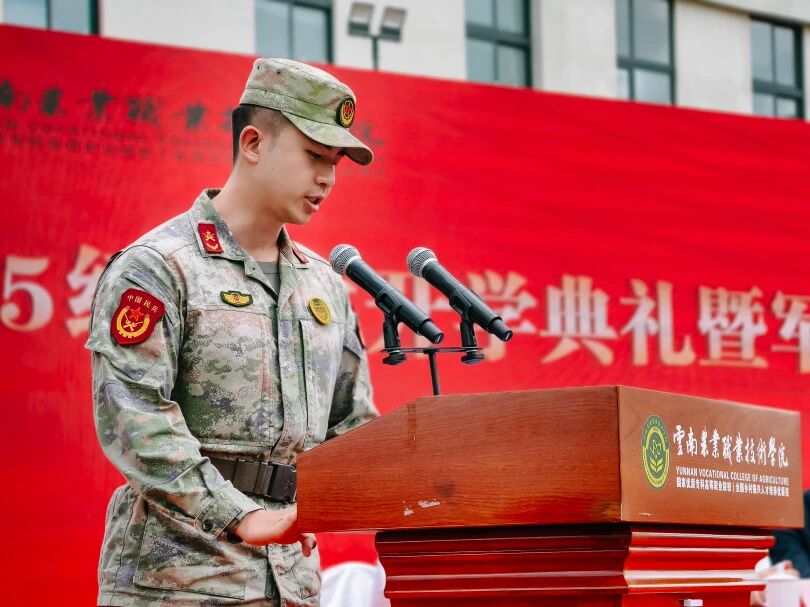 畜牧兽医学院(宠物科技学院)段钰、云安农文旅产业学院王悦瑶作为学生代表发言,她们代表新生郑重承诺,将在军训期间端正态度、团结互助、收获成长,在训练场展现百折不挠、实干笃定的云农院学子风采。