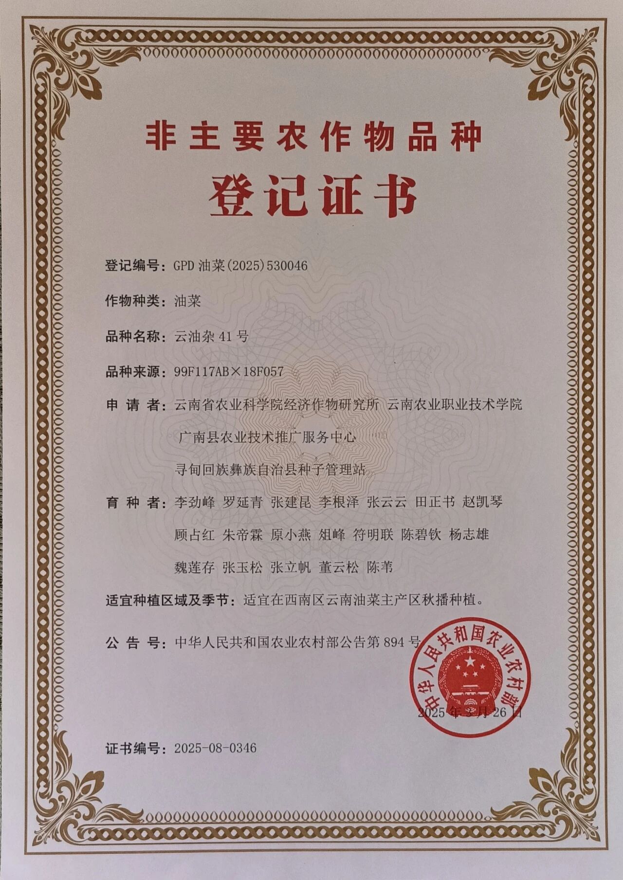 近日,由sunbet官网小哨校区云南省油菜育种联合基地与云南省农业科学院经济作物研究所联合选育的油菜新品种“云油杂41号”获准《中华人民共和国农业农村部公告第894号》认定登记,标志着sunbet官网在油菜育种领域的科研实力再获认可。
