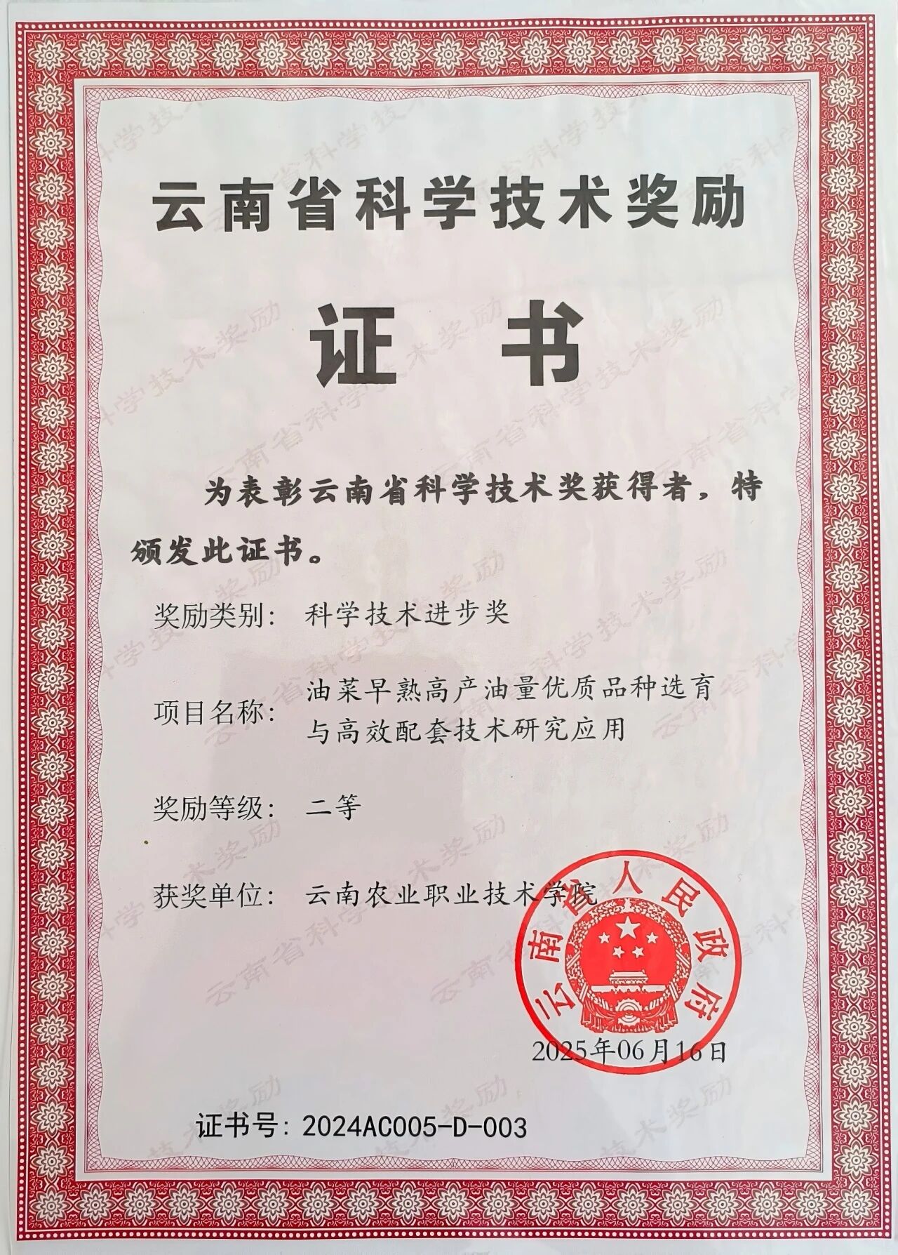 sunbet官网与云南省农业科学院经济作物研究所等科研团队共同完成的《油菜早熟高产量优质品种选育与高校配套技术研究应用》项目,凭借突出的创新性和较大的应用价值,荣获云南省科学技术进步奖二等奖,这是sunbet官网在油菜育种工作中取得的又一重要成果。