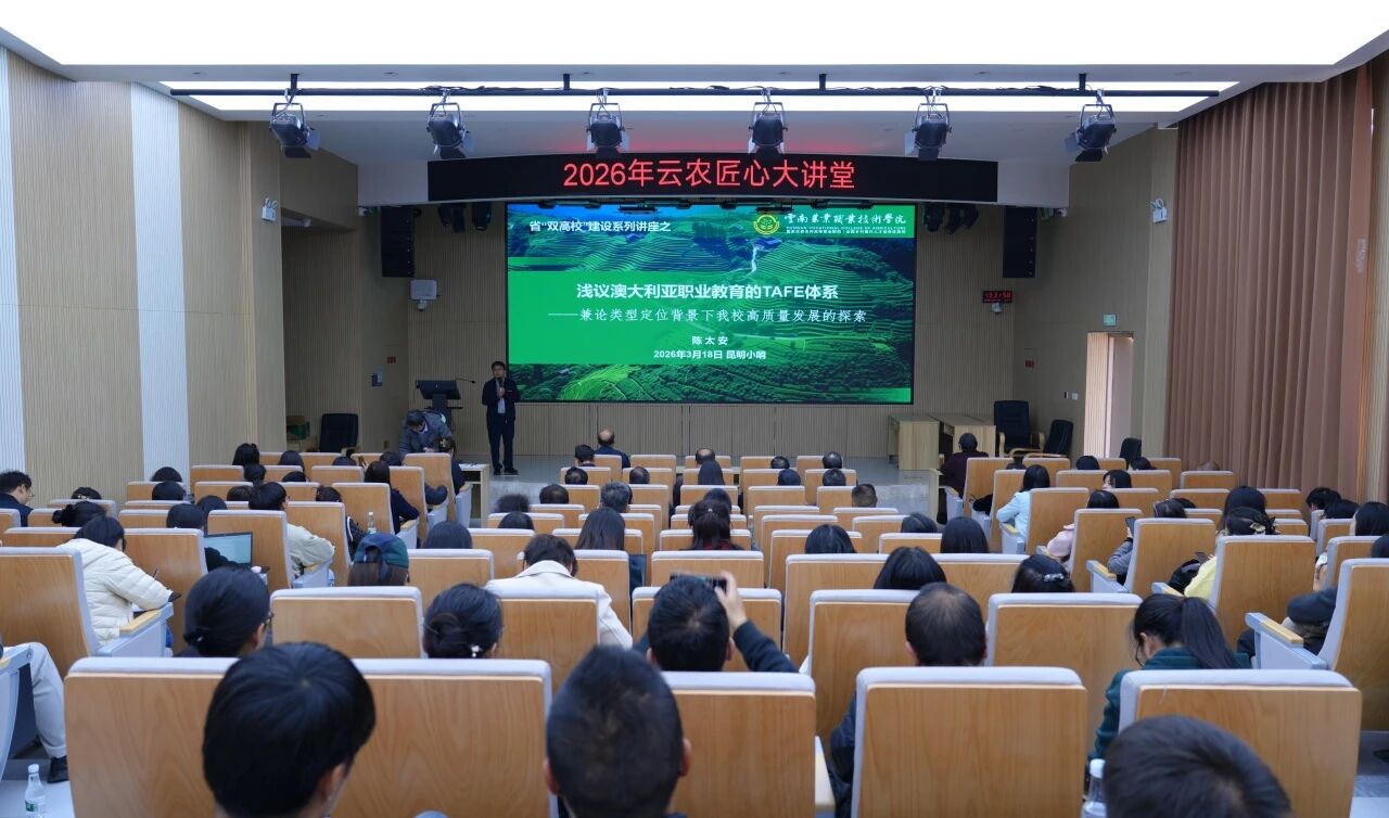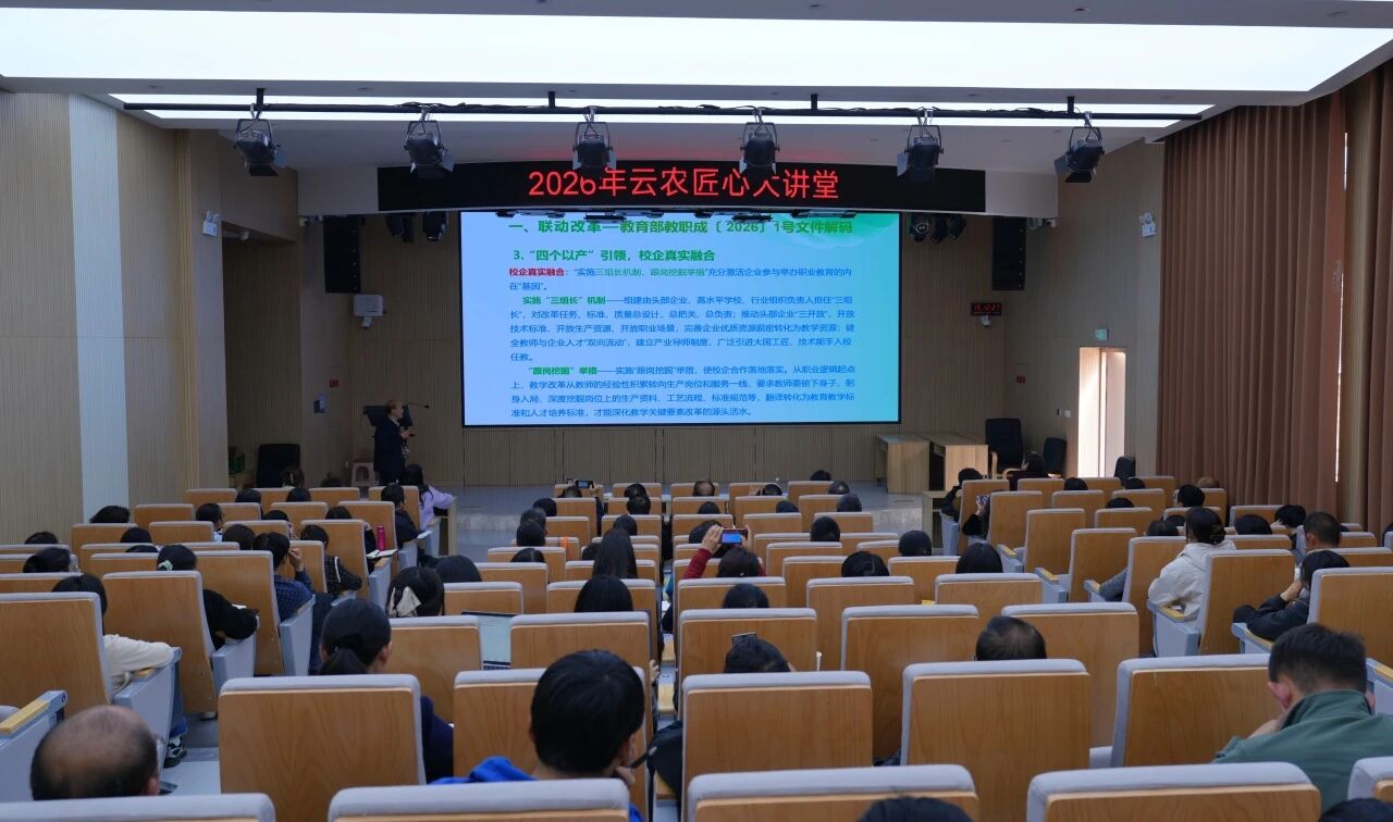 为全面落实省级“双高”学校建设各项任务,纵深推进职业教育内涵式改革,加快推动学校高质量发展步伐,3月18日下午,由科研产业处主办,农学与园艺技术学院、教务处承办的2026年“云农匠心”大讲堂2026年第一期、第二期在小哨校区综合楼阶梯教室开讲。本轮讲座聚焦职业教育国际先进经验借鉴与课程教材改革两大主题,统筹部署学校双高建设重点工作,为学校打造高水平农业职业院校、培育高素质技术技能人才指明方向、明晰路径。