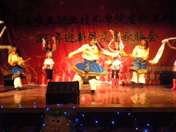 晚会以一首曲调激昂的粤语弹唱《不再犹豫》拉开了帷幕。晚会有歌曲、舞蹈、小品、武术等节目。2012级同学的舞蹈《cry、cry》把全场气氛推高到了极点;2013级新生的健美操和《鬼步舞》展现出了他们的朝气、青春与活力。2011级学长学姐也不甘落后,他们表演的舞蹈《野人狂欢》狂野而奔放。泰国同学的泰语说唱《男孩》和泰国舞蹈,让观众领略到了泰国风俗文化的魅力。五年制大专班的同学表演了《梅里雪山的儿女》,高难度的连续单腿旋转和往复空翻技惊四座,赢得满堂喝彩。歌曲《最幸福的人》、《不要怕》又把观众带入了一个空灵澄澈的境界。学院武术协会的同学应邀表演了《刀光棍影》,展现了响刀、双截棍等中国冷兵器和传统招式。最后晚会在电子琴独奏《梦中的婚礼》和我系吉祥物“生生”的月饼大派发中结束,礼堂内始终洋溢着欢乐气氛,不时爆发出阵阵掌声。