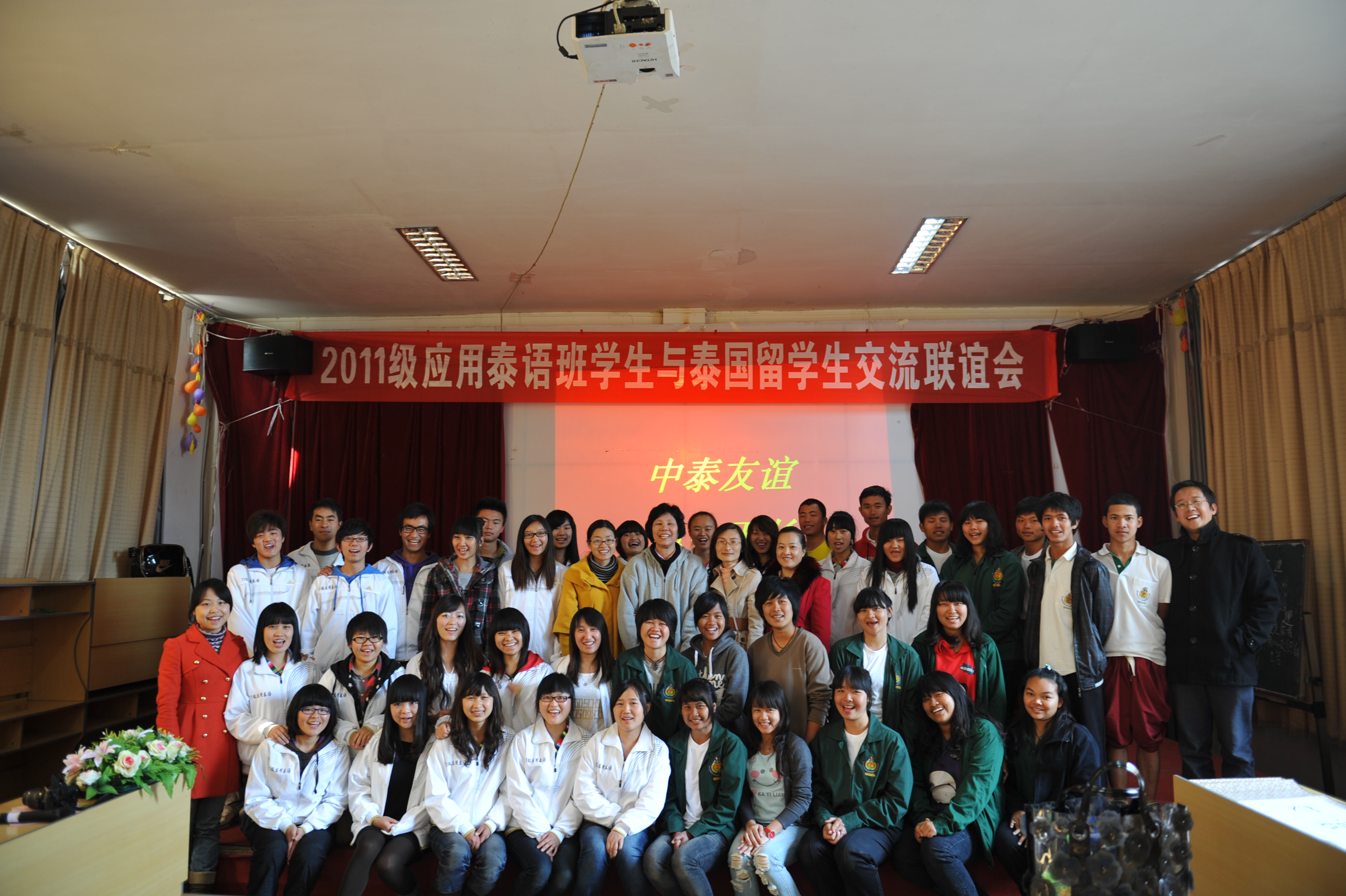 通知中心 2011年11月23日上午,基础部2011级应用泰语班学生与我院第六批泰国留学生交流联谊会在小哨校区多媒体教室三举行。基础部副主任李憬、对外合作交流处教师郑芳、泰语教研室教师汤林芸、2011级应用泰语班学生和泰国18名留学师生出席了此次联谊会。
