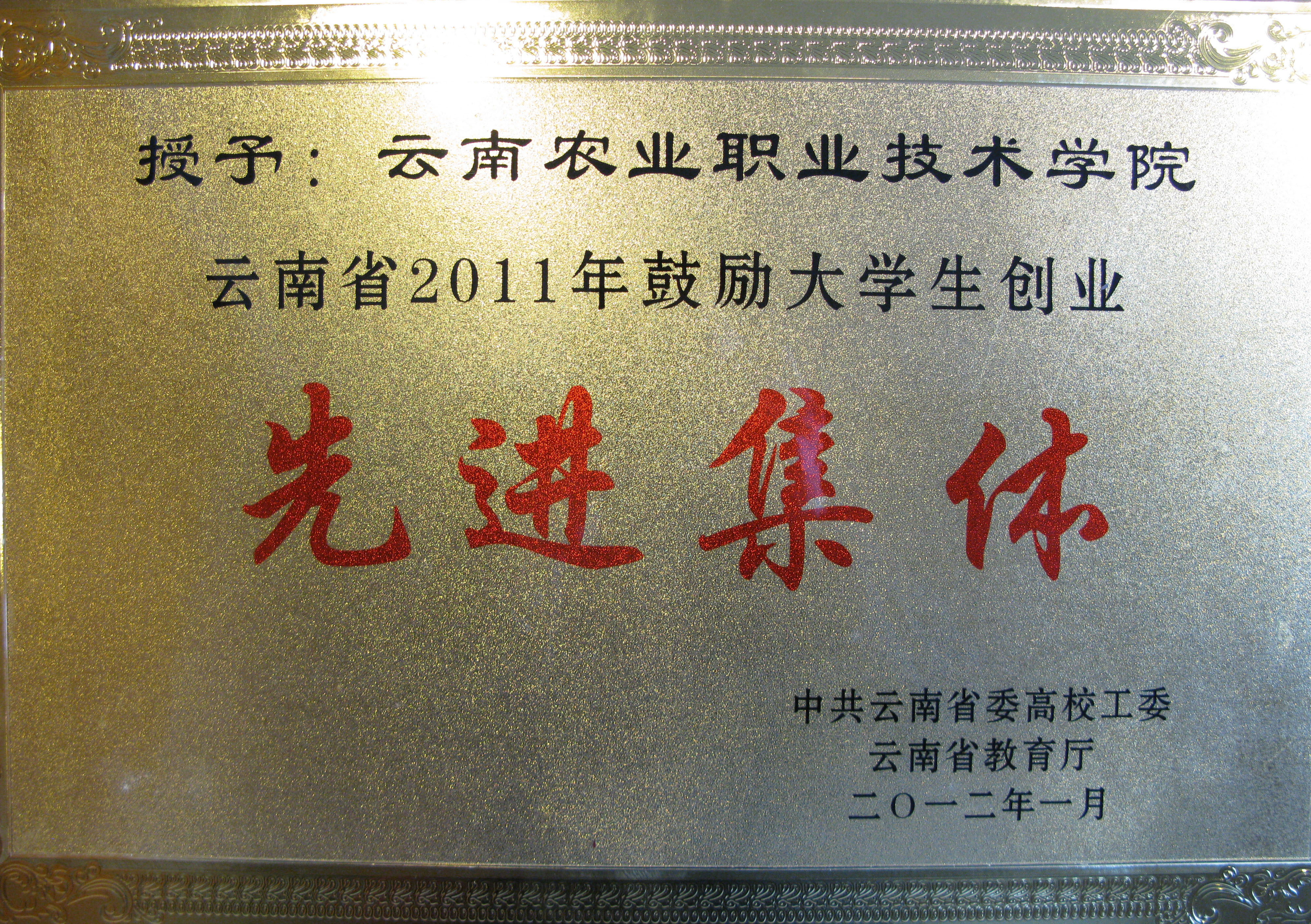其中,我院荣获云南省高校工委、省教育厅颁发的“2011年就业工作目标责任考核一等奖”;荣获云南省高校工委、省教育厅颁发的“2011年鼓励大学生创业先进集体”荣誉称号。这是省高校工委、省教育厅对我院2011年在就业工作以及帮助鼓励大学生创业工作成绩的充分肯定和鼓励。(党委宣传部供稿)