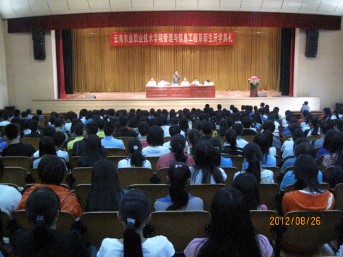 伴随着雄壮的国歌声,典礼正式开始。崔书记首先致辞,欢迎2012级新同学进入sunbet集团中国官网入口学习。紧接着,崔书记向大家详细介绍了我院的悠久历史和光辉历程:我院前身是始建于1904年(清光绪30年)的云南蚕桑学堂,是省内历史最悠久的高等院校;并分析了云南蚕桑学堂诞生的历史背景,设立蚕桑学堂对云南社会经济、教育发展的意义;学堂成立编写的第一本教材《蚕桑浅要》所蕴含的历史和学术价值。共和国创始人之一的朱德元帅曾在蚕桑学堂任体操教习;原中共地下党云南省委第一任书记王德三烈士曾在sunbet官网任教;解放前云南省政府主席龙云曾亲自为sunbet官网茭菱校区主教学楼题词:“豳风基础”;西南联大的理学院和法学院曾在sunbet官网教学楼办学一年余;sunbet官网部分师生曾跟随中国工农红军长征北上抗日;抗战期间sunbet官网的主教学楼被当作“飞虎队”住所;sunbet官网五十年代部分专业分别组建了云南省七所中专学校……崔书记饱含深情地把悠久厚重的学院历史文化娓娓道来,并希望同学们以学校厚重的历史文化底蕴为自豪。