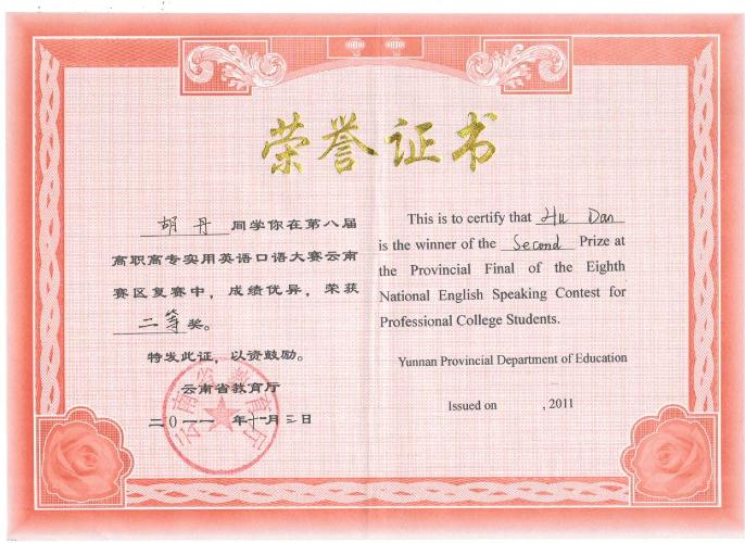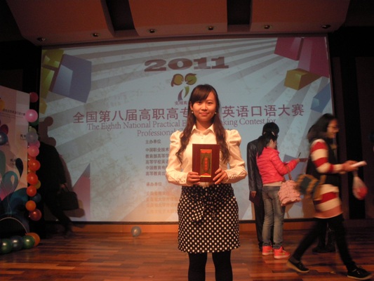 2011年11月3日上午,第八届全国高职高专实用英语口语大赛云南赛区复赛在云南文化艺术职业学院举行。我院第二届“英语之星”——2010级农产品检测专业胡丹同学代表学院参加了该项比赛,并荣获大赛非专业组二等奖。